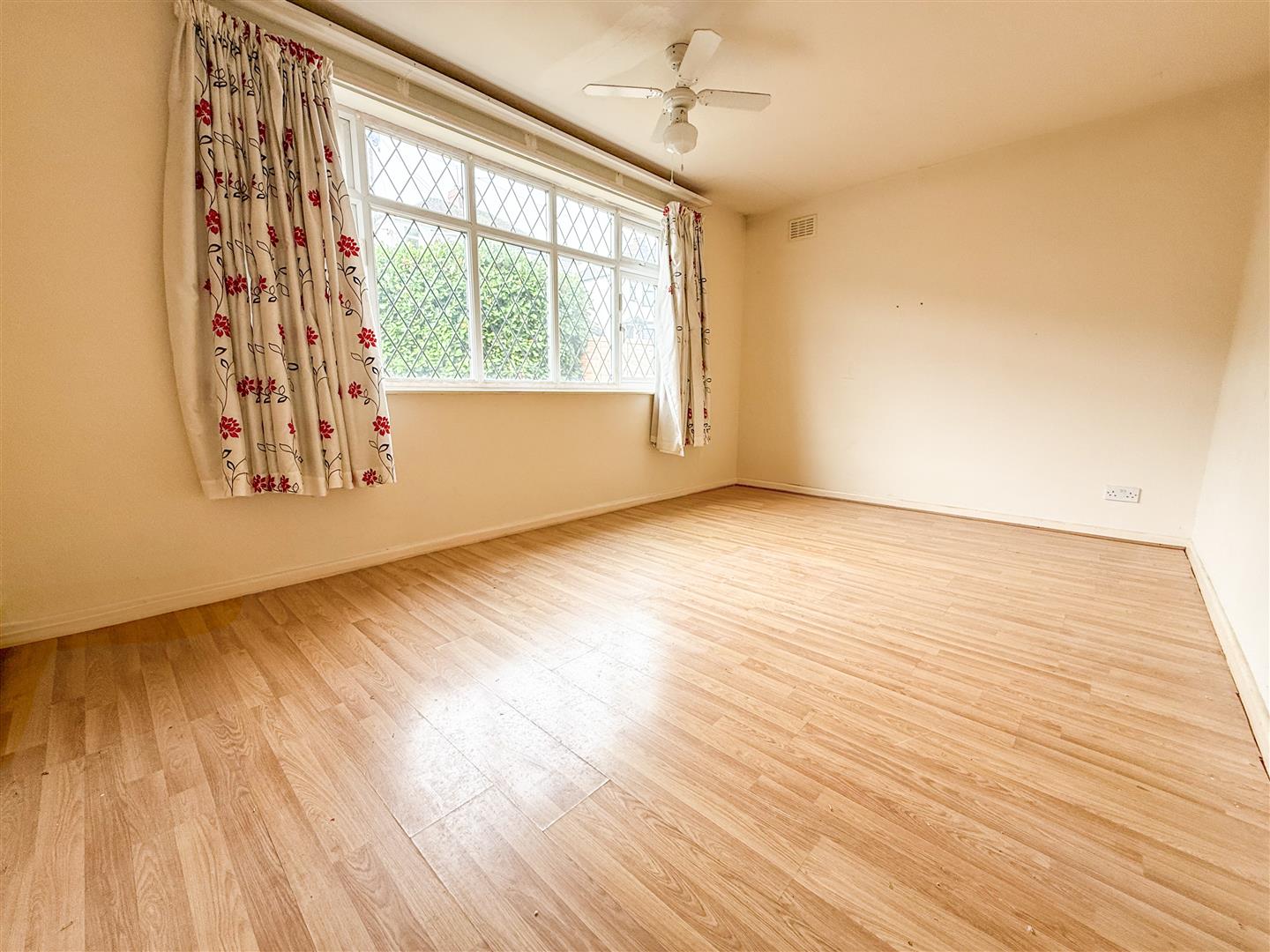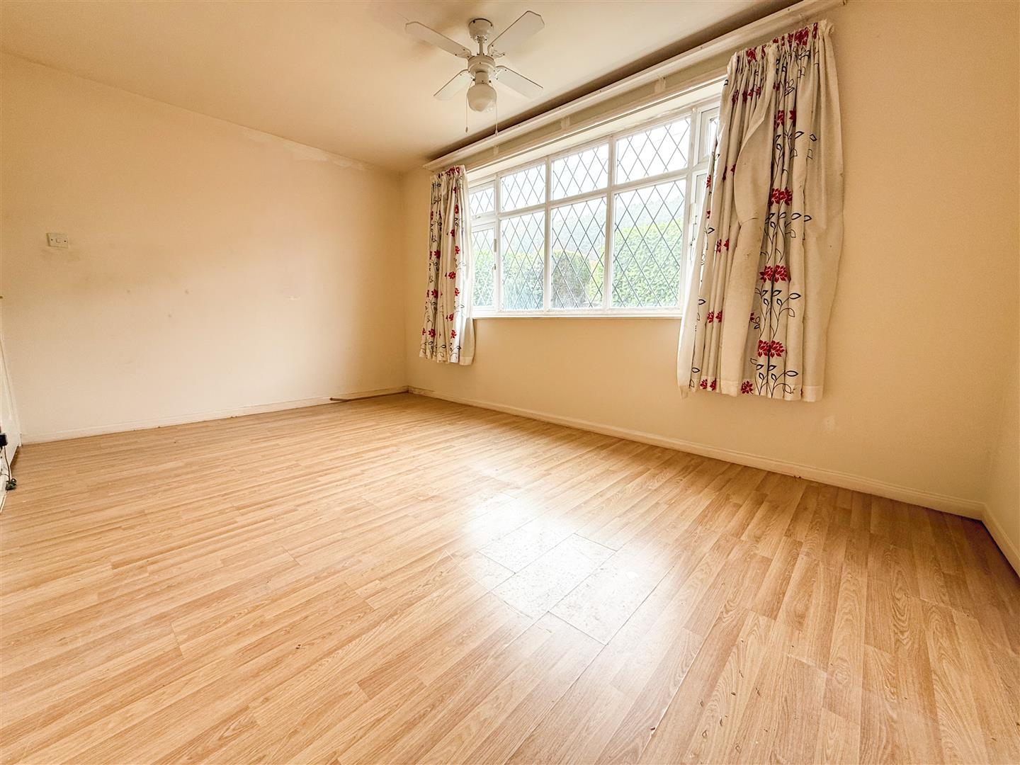 The primary bedroom features a large window to the front elevation, flooding the room with natural light. Finished with wood-effect flooring and a central ceiling light point, it offers a bright and comfortable space.