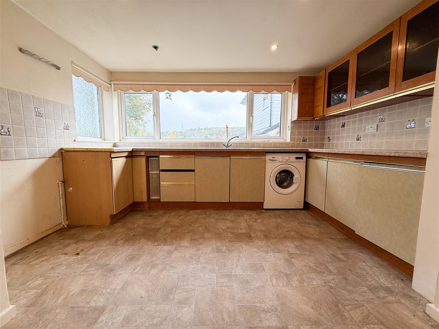 The kitchen is fitted with a selection of wall, base, and drawer units, offering practical storage and functionality. Roll-top work surfaces and a one-and-a-half bowl sink with drainer and mixer tap complete the layout. A large rear-facing window allows for plenty of natural light, with an additional obscure glazed window to the side. There is space and plumbing for a freestanding oven and hob, washing machine, and upright fridge freezer. The room also benefits from spot lighting, an extractor fan, and lino flooring.