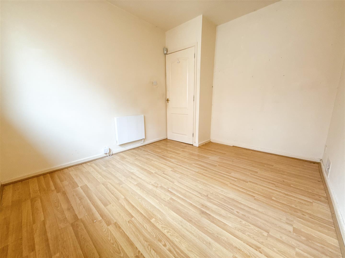 Bedroom two features a window to the side elevation, providing ample daylight and ventilation. The room benefits from wood-effect flooring, an electric radiator, and a central ceiling light point, offering a flexible space suitable for various uses.