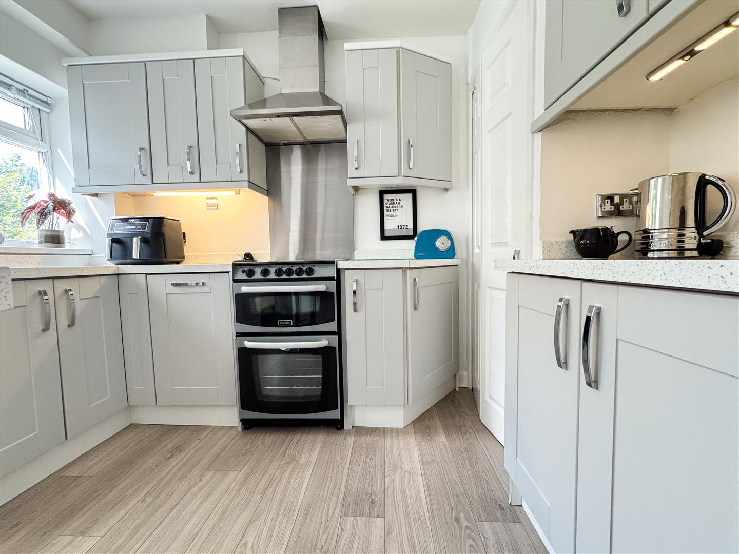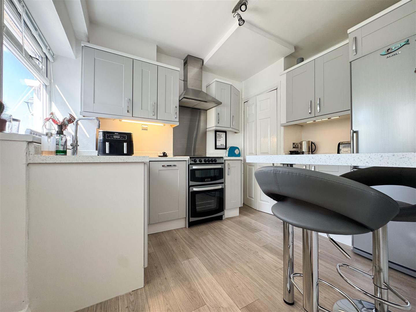 Consisting of; Pale grey wall and base units; White Quartz effect worktops and upstands; Breakfast bar seating area; Under unit lighting; Single sink and drainer with mixer tap; Set beneath an uPVC double glazed window to the rear elevation; Fitted blind; Freestanding oven, with brushed steel splashback and extractor hood above; Upright fridge freezer; Integrated slimline dishwasher; Bi-folding door to under stairs pantry zone; Wood effect laminate flooring; An uPVC double glazed stable style door to the conservatory;