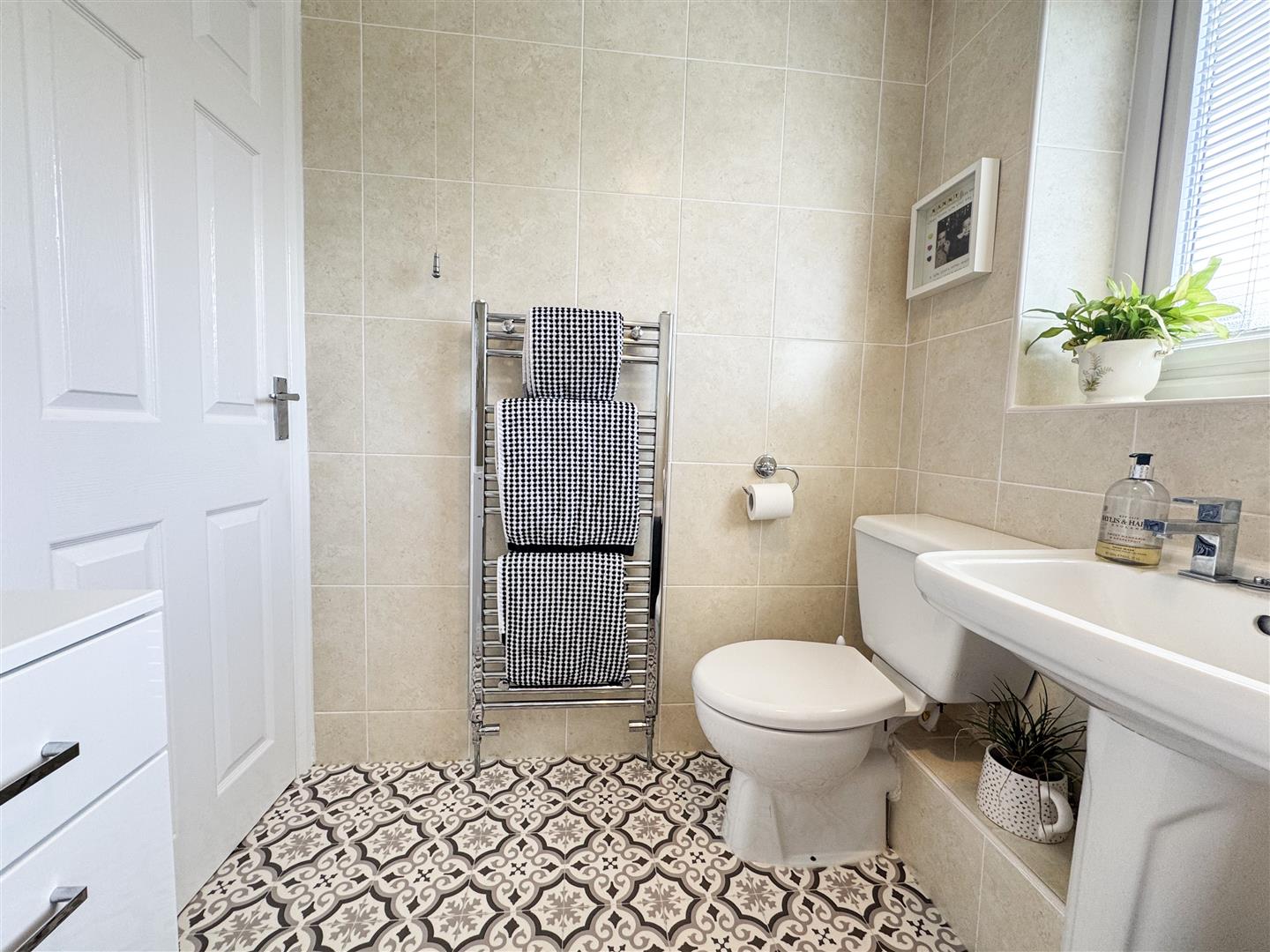 The primary bedroom has; Fitted wardrobe storage, with louvre doors; uPVC double glazed window to the front elevation; Fitted Blind; Carpet flooring; Ceiling light point; Coving; Central heating radiator;