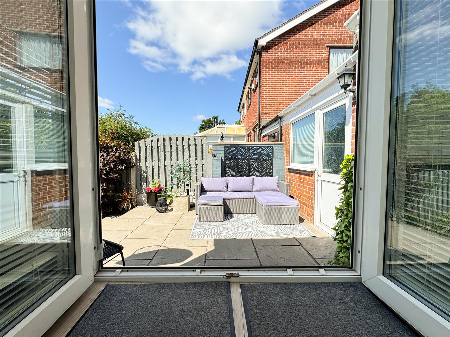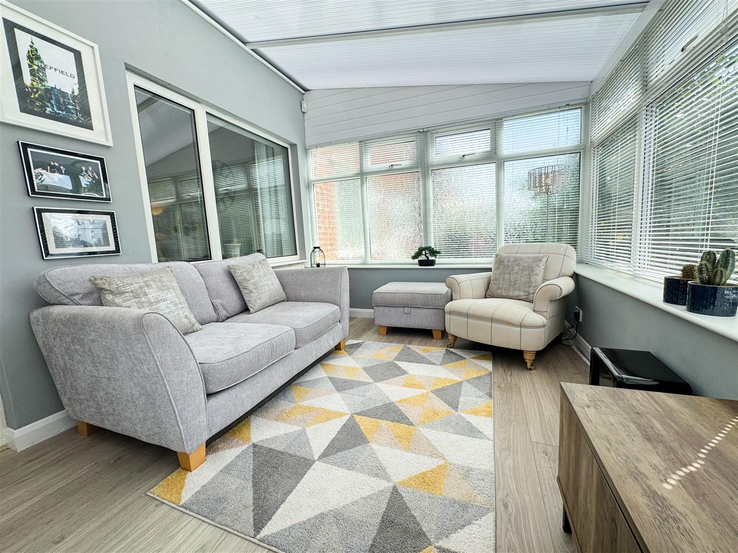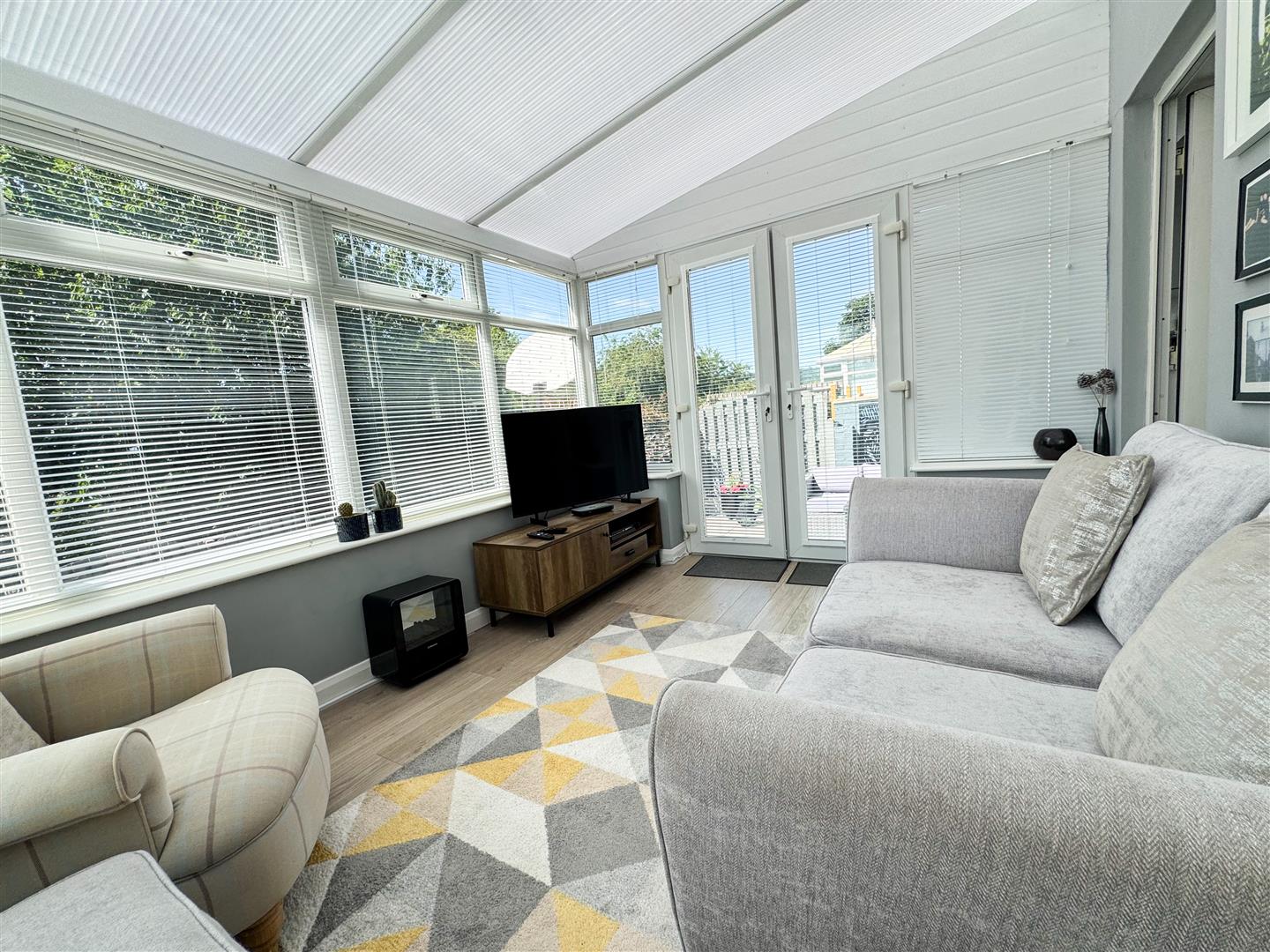 A lovely rear garden facing sitting area comprising of; uPVC double glazed windows to three aspects, one side having obscure glazed windows for privacy; Fitted blinds to all windows; Wood effect laminate flooring; Central heating radiator; Double doors open to the side elevation steps, leading down to the patio;