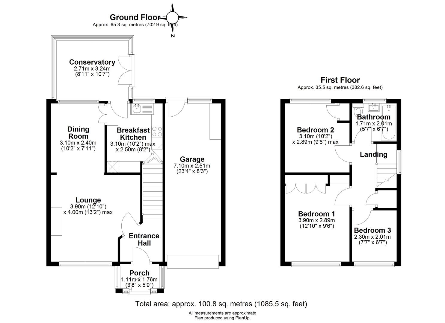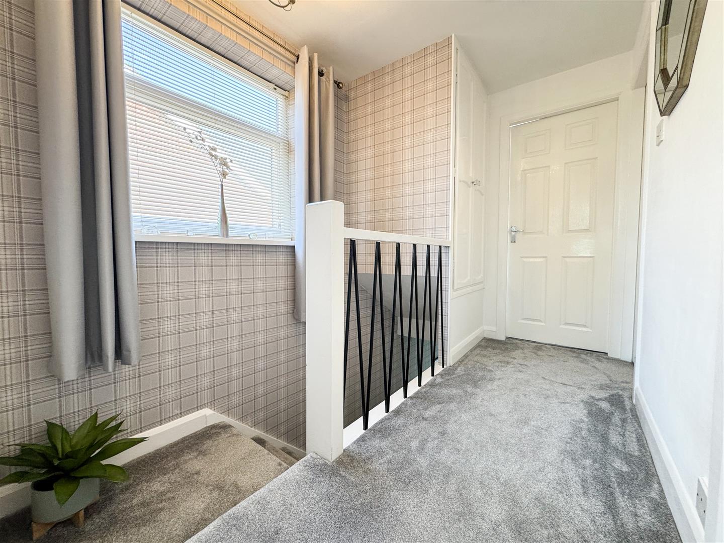 Carpeted stairs rise to the landing area with; Black iron and white painted balustrade; Solid doors to the three bedrooms and family bathroom; Good sized uPVC double glazed window to the side elevation; Fitted blind; Loft hatch access; Ceiling light point; Double doored storage area;