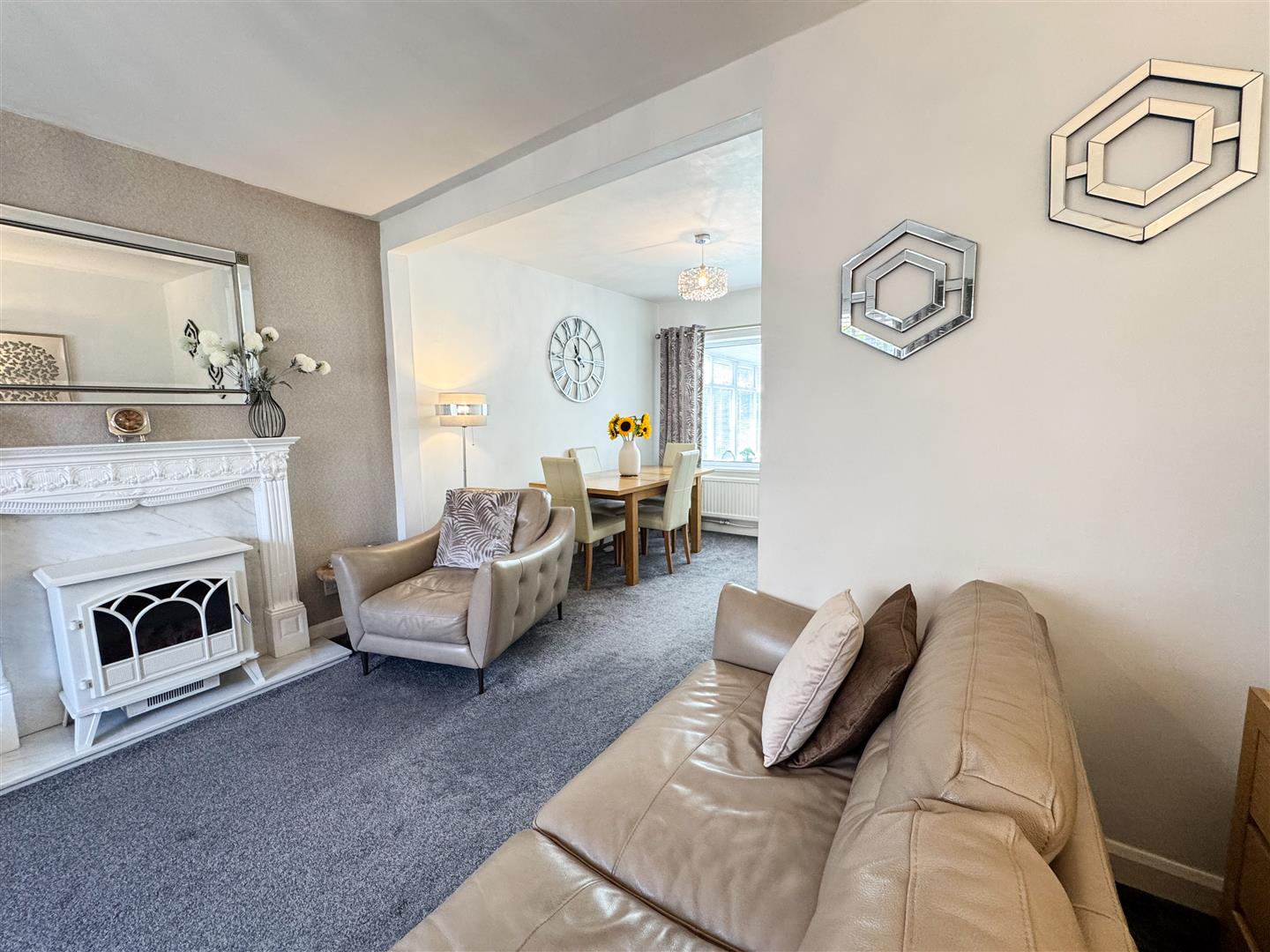 This beautifully presented lounged has; Feature fireplace; uPVC double glazed front facing window, with fitted blinds; Ceiling light point; Central heating radiator; Open arch to dining area;
