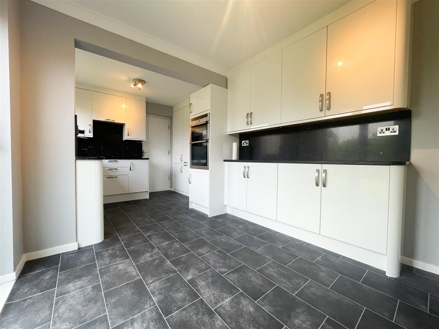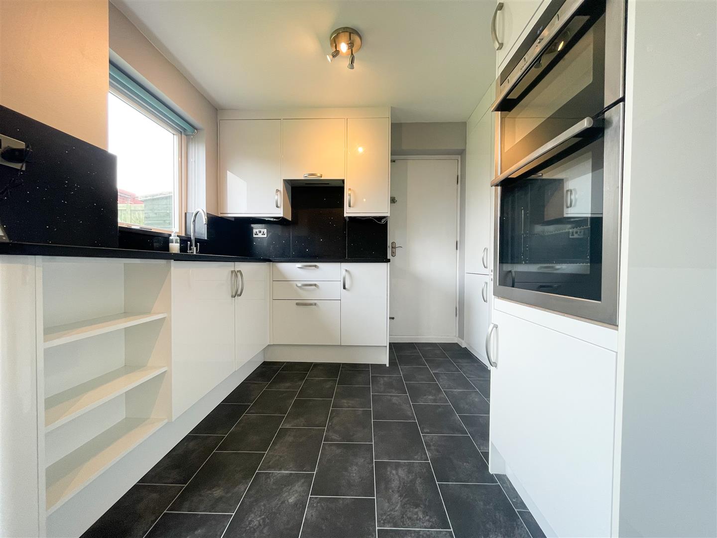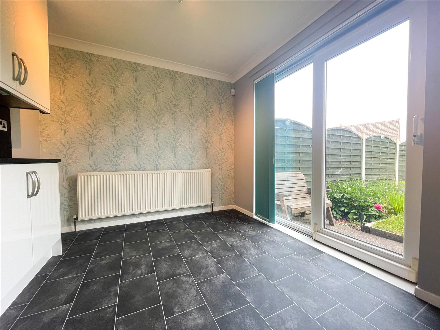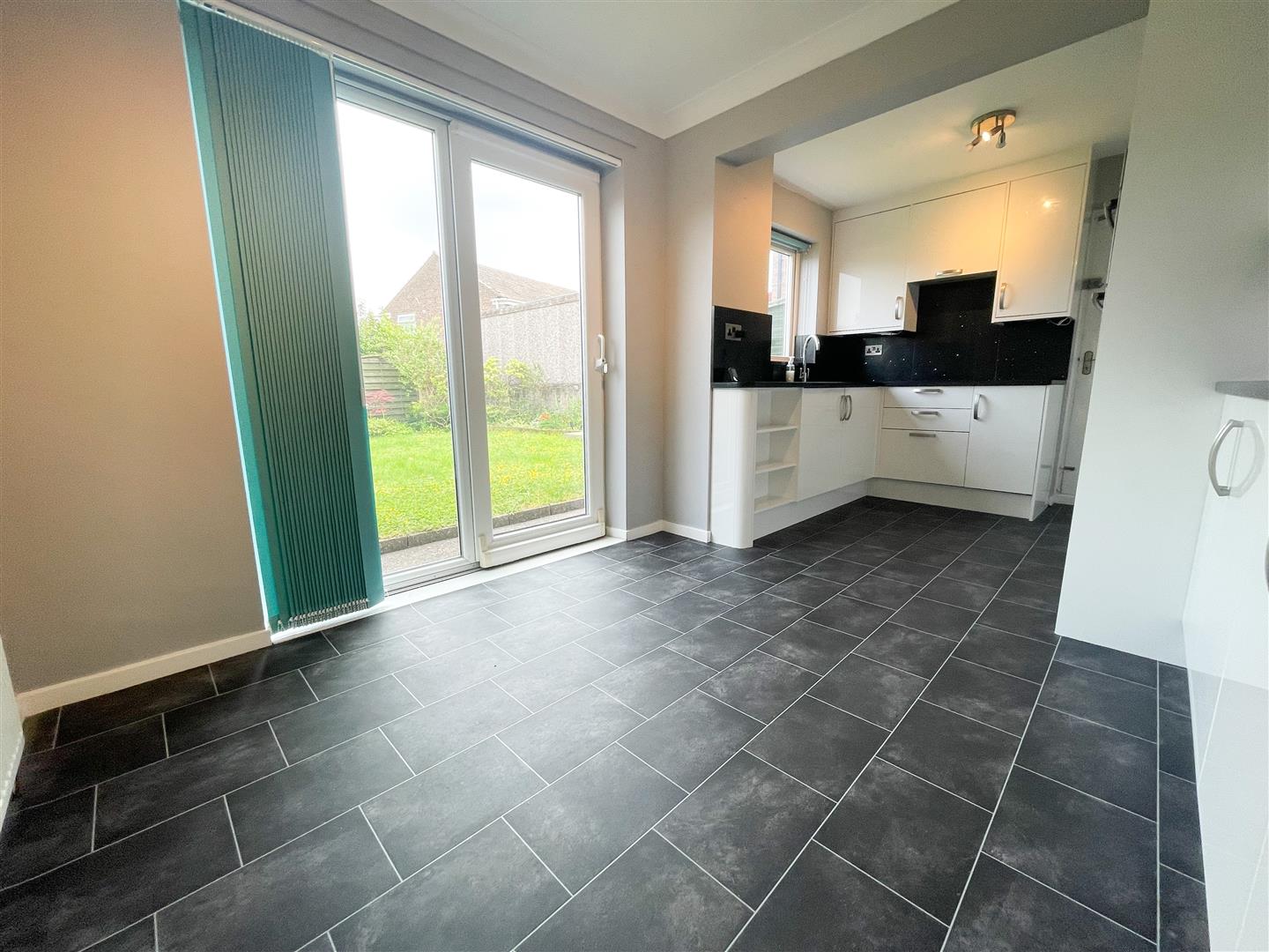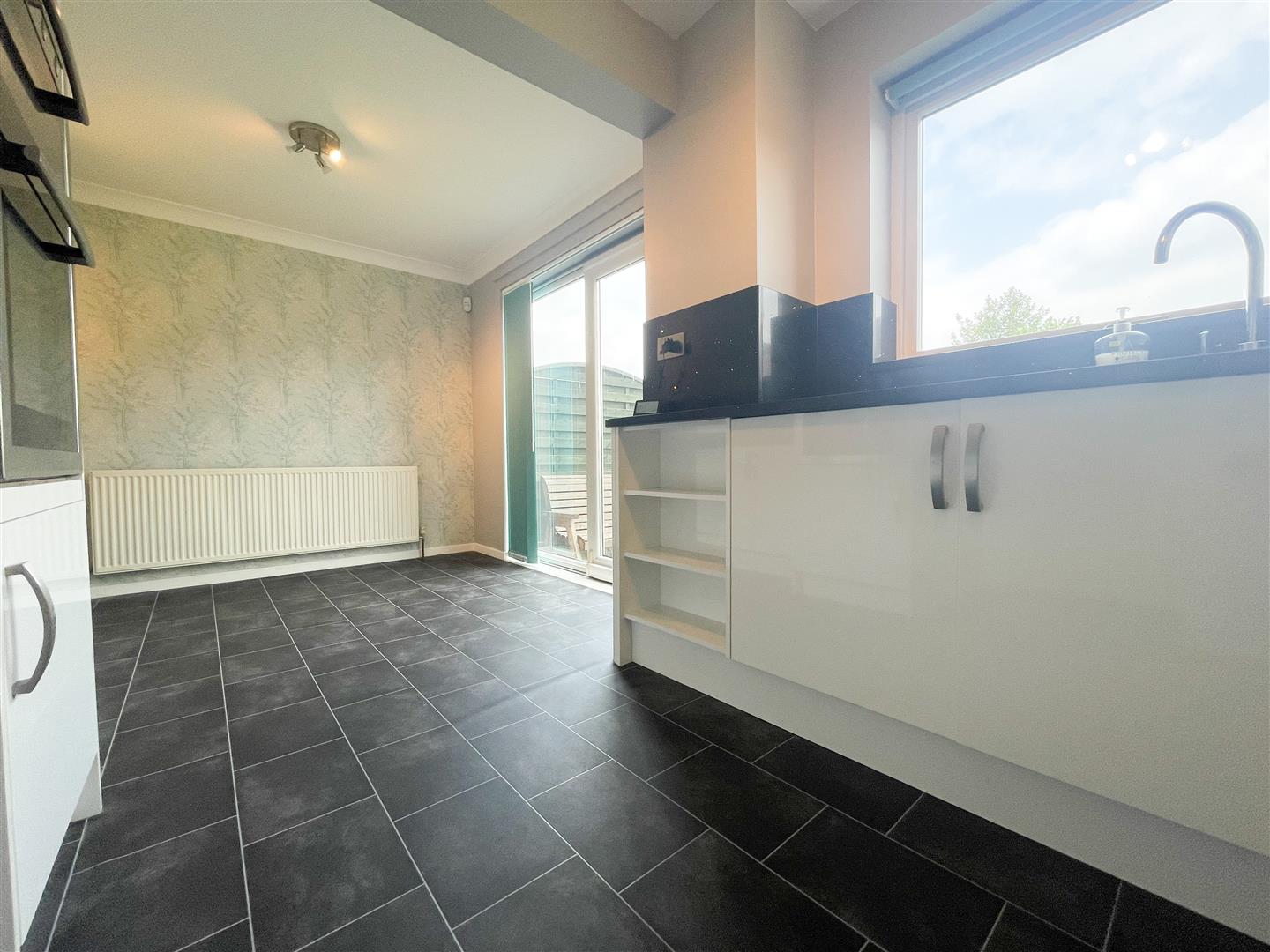 This modern kitchen has; A good range of wall, base and drawer units with sleek black worktop and splashback; Single sink and drainer with mixer tap; Integrated double oven, dishwasher and four ring induction hob with an extractor fan above; Space for an upfright fridge freezer; Space for dining table and chairs; Rear facing uPVC double glazed window; Glazed patio doors entering rear garden; Solid doors accessing storage cupboard and garage; Vinyl flooring; Central heating radiator; Painted walls; Ceiling light point;
