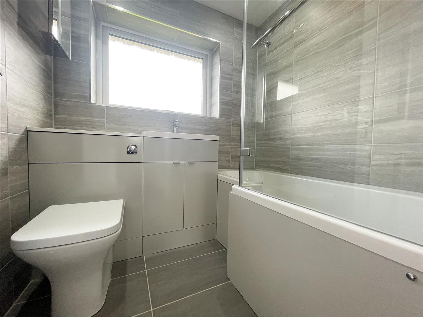 Comprising of; WC and wash basin set into vanity storage unit; Panelled bath with wall mounted shower and side screen door; Vertical heated towel rail; Wall mounted mirrored cabinet; Tiled flooring; Ceiling light point;