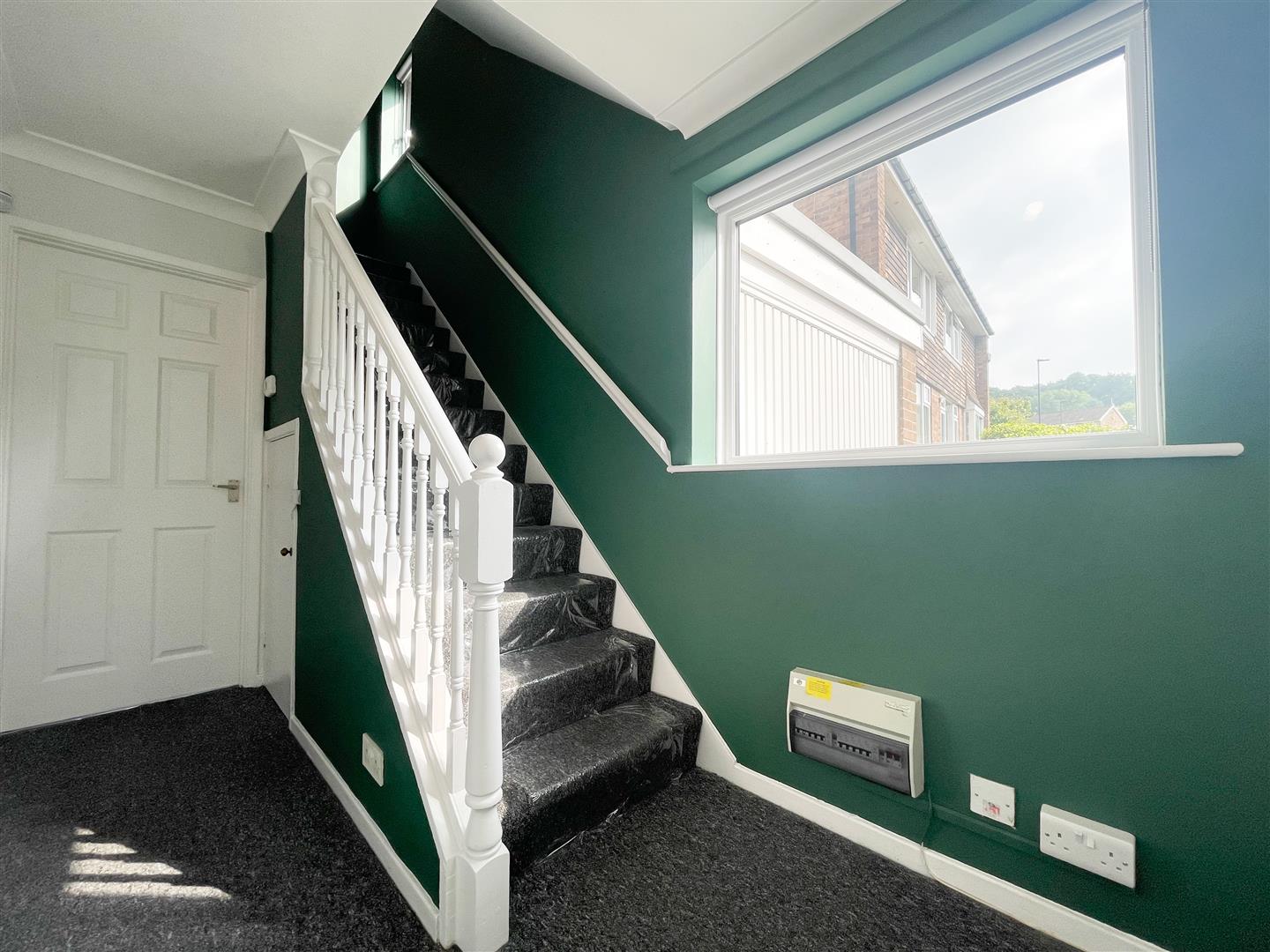 Entered via uPVC part glazed door, with; uPVC double glazed window to side elevation; Carpet flooring; Stairs leading to first floor; Painted handrail and banister; Under stairs storage cupboard; Painted walls; Ceiling light points; Central heating radiator;