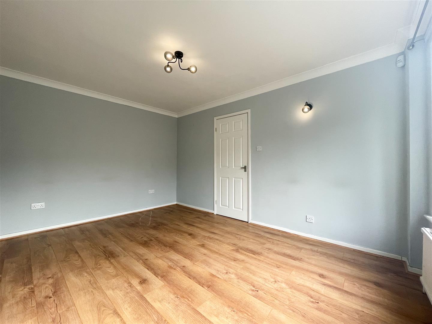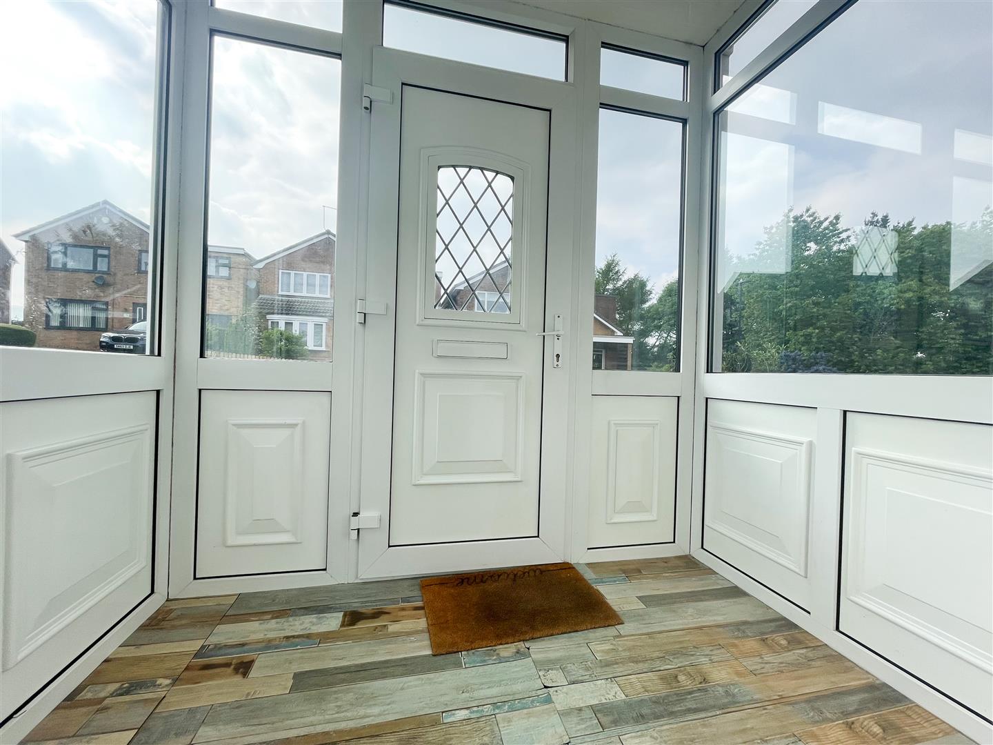 The property is entered via uPVC part glazed door; uPVC double glazed windows to three aspects provide lots of natural light; Wall light point; Wood effect flooring; Entrance door through to the hallway;