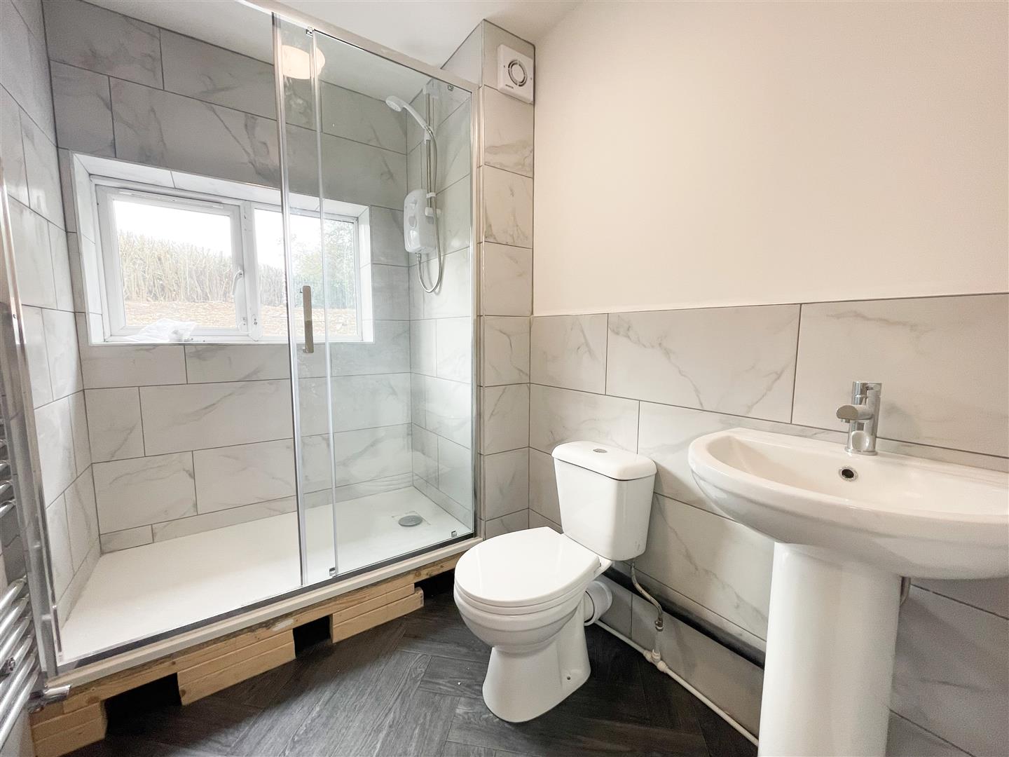 Modern bathroom; Comprising of; Shower with glass screen door and wall mounted electric shower; Pedestal wc and sink with mixer tap; Sleek marble affect tiles to wet arears; Remaining painted walls; Heated towel rack; Rear facing uPVC double glazed window; Ceiling light point; Extractor fan;