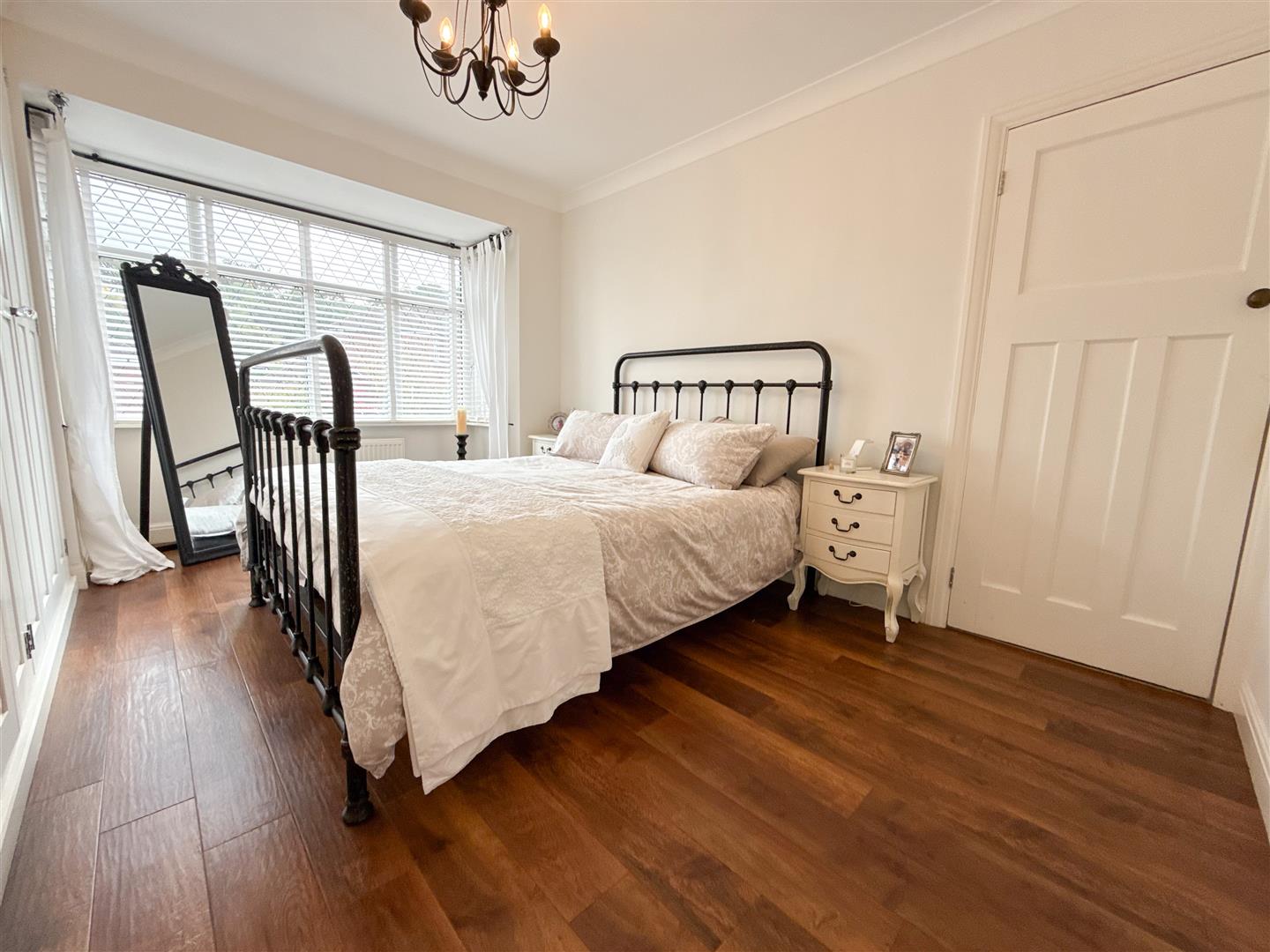 A spacious second bedroom, filled with light from a large bay window to the rear elevation overlooking the garden. Karndean flooring adds warmth underfoot, complemented by a ceiling light point and central heating radiator, offering a bright and inviting environment.