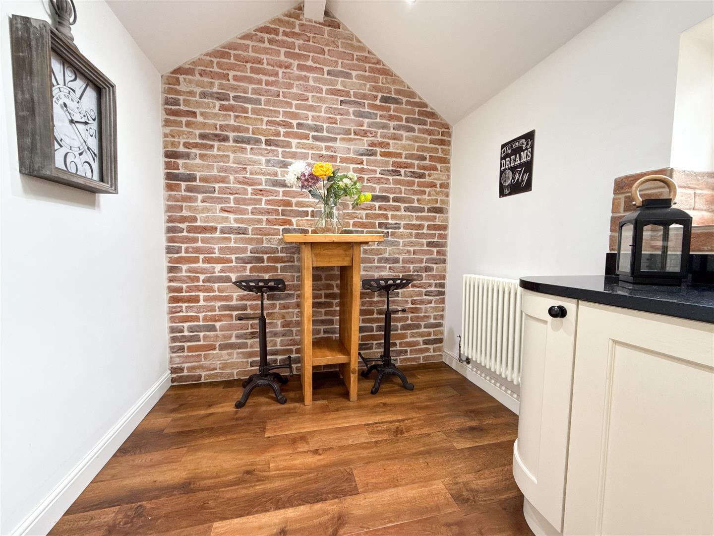 This delightful, generously proportioned kitchen is beautifully presented and designed with both practicality and elegance in mind. Fitted with an excellent range of cream wall, base, and drawer units topped with sleek black quartz worktops, it features under-unit and backlighting, exposed brickwork detailing, and a classic Belfast sink beneath a uPVC double-glazed window overlooking the rear garden. Integrated appliances include a full-size fridge and freezer, double oven, dishwasher, washing machine, and an induction hob with extractor hood. Three Velux windows and recessed ceiling spotlights ensure the room is filled with light, while karndean flooring, a central heating radiator, and space for a small table or breakfast bar provide a comfortable and versatile family space. A glazed door leads directly into the garden, with a solid door providing access to the garage.