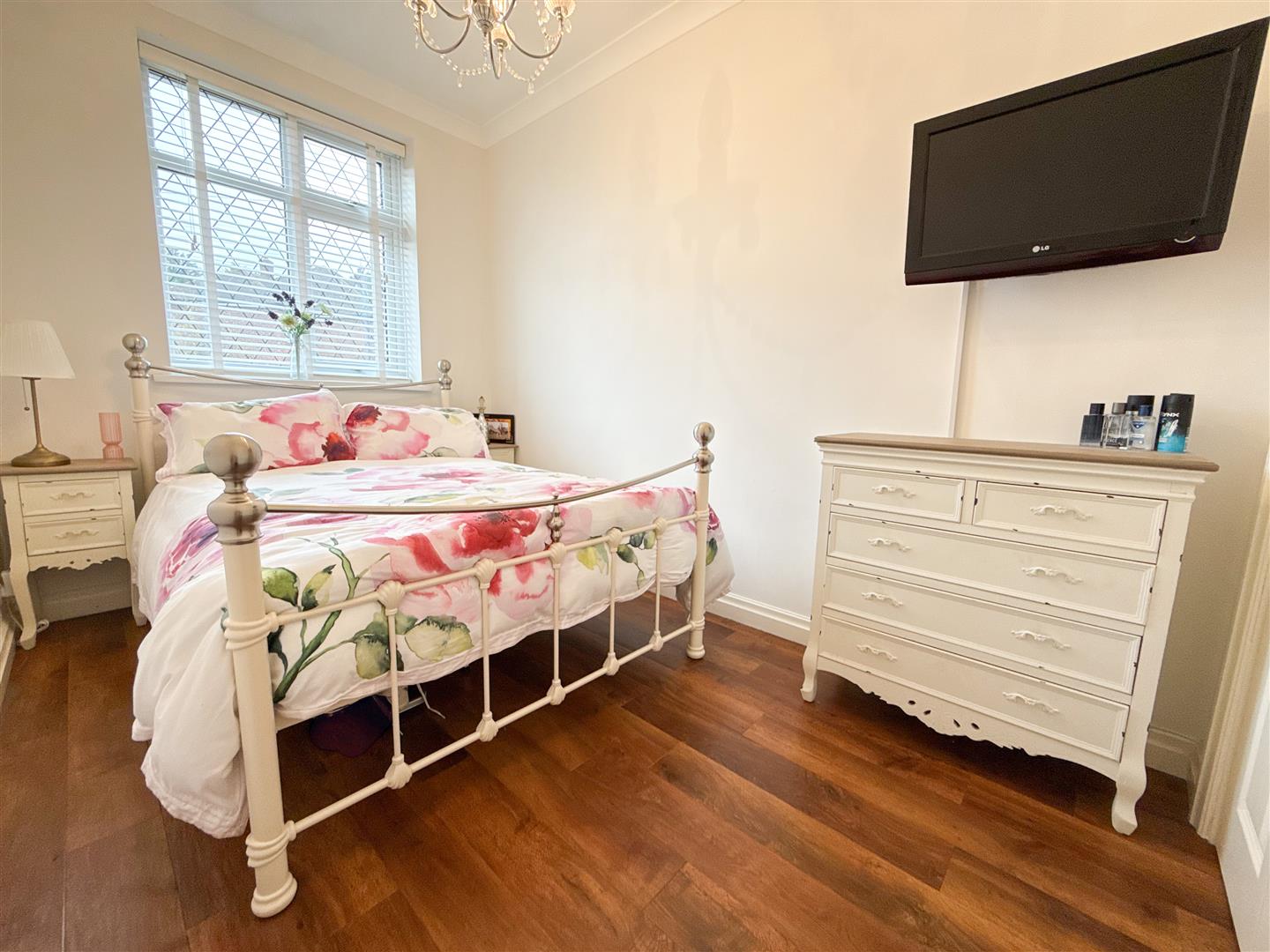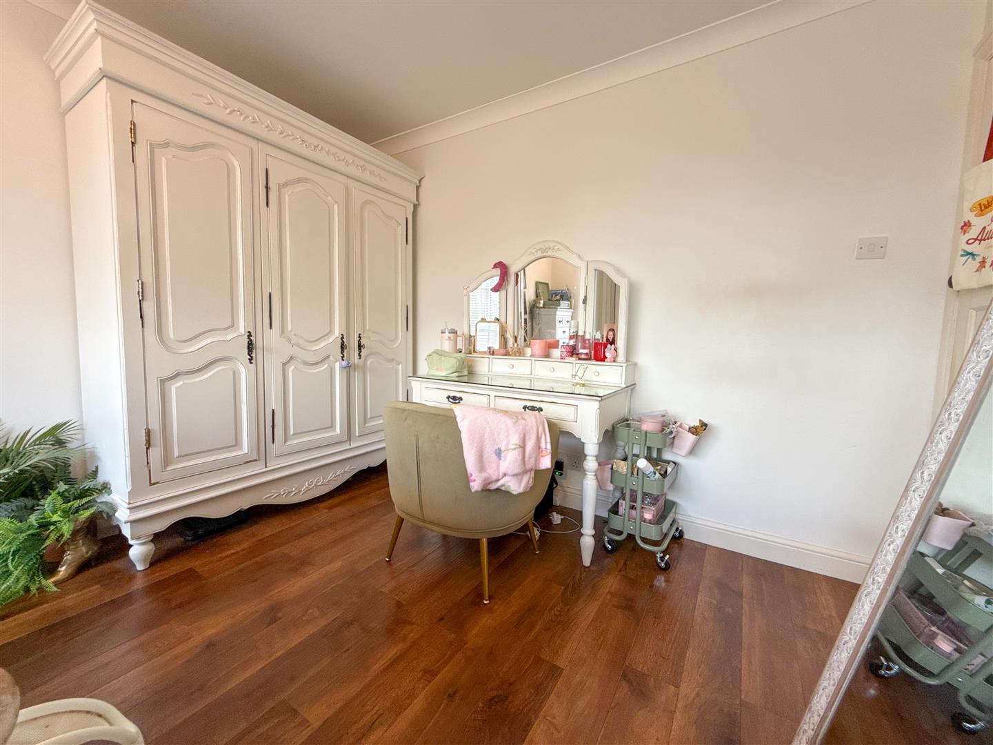 A bright third bedroom with karndean flooring and a uPVC double-glazed window to the front elevation. A solid bi-fold door conceals a useful storage area, complemented by a ceiling light point and central heating radiator, creating a comfortable and inviting room.