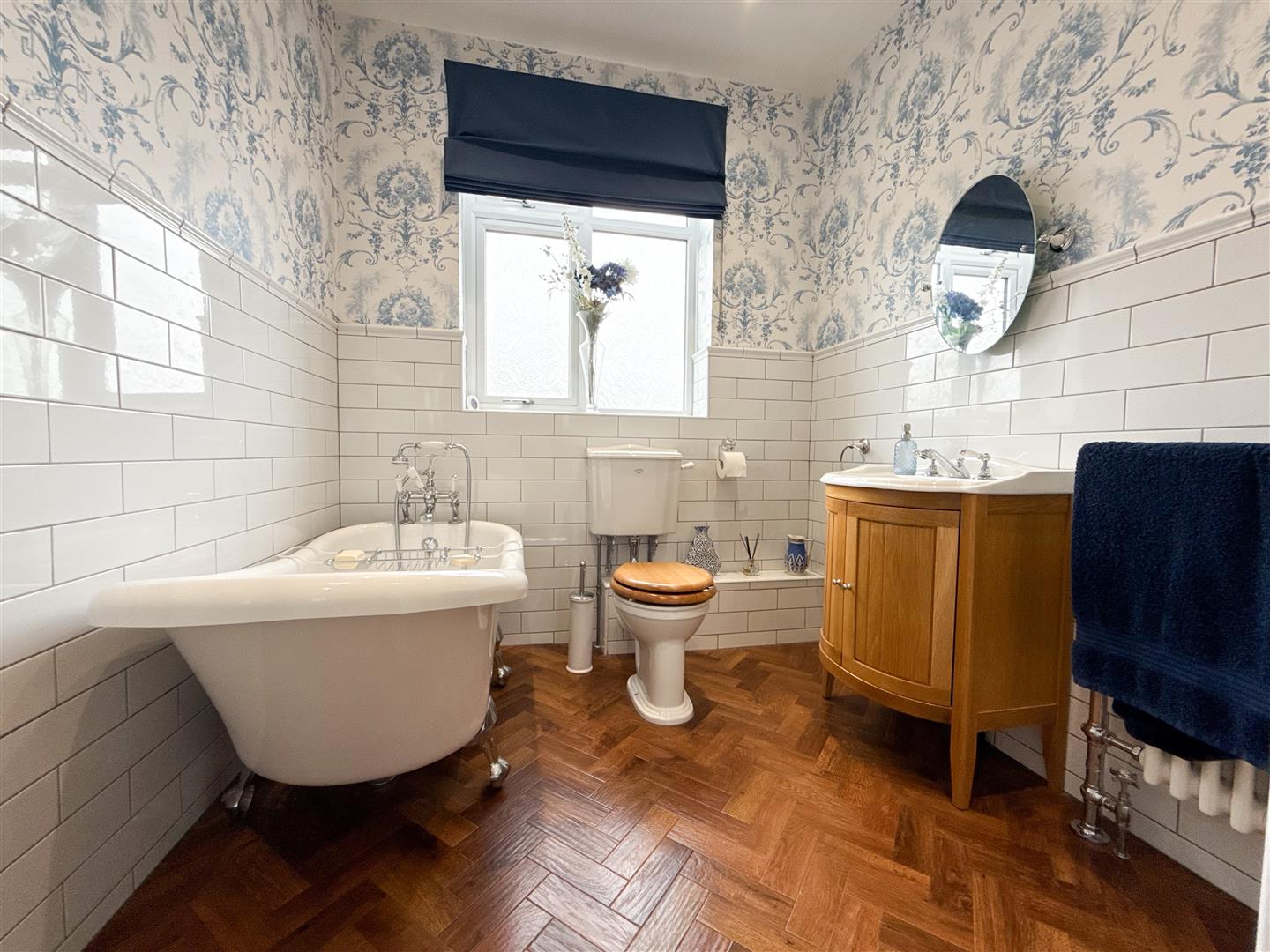 A gorgeous, contemporary family bathroom, thoughtfully designed with a WC and wash basin set into a sleek vanity storage unit. The room features a freestanding bath with a telephone shower attachment, a separate shower enclosure with wall-mounted shower and sliding screen, and beautifully tiled walls enhanced with feature wallpaper. A uPVC double-glazed obscure window to the rear elevation provides privacy while allowing daylight to filter in. Karndean herringbone flooring, recessed ceiling spotlights, an extractor fan, and steel towel rails complete this elegant and practical space.