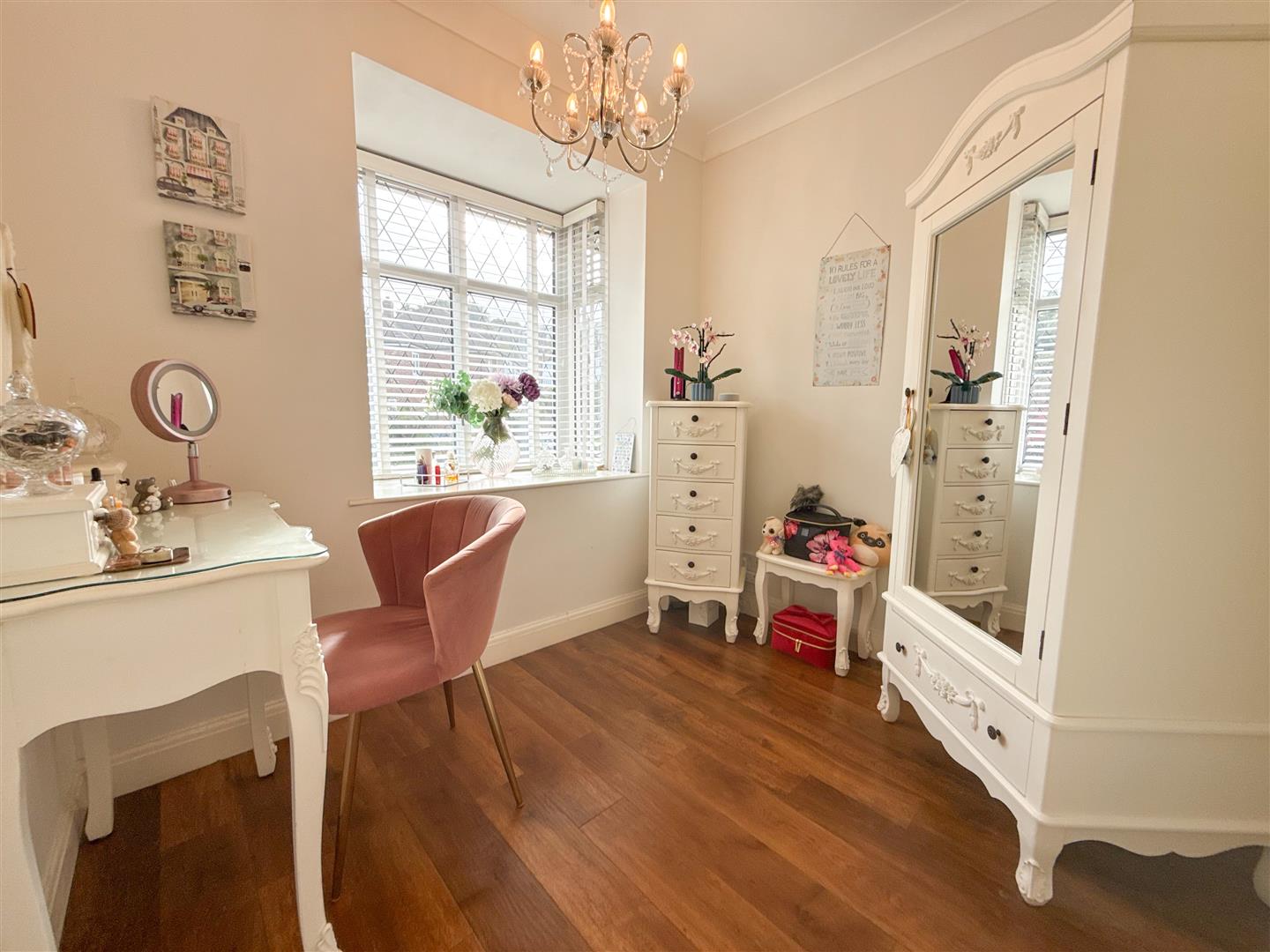 A charming fourth bedroom currently used as a dressing area, offering flexibility to suit the buyer’s needs. The room features a bay window to the front elevation, karndean flooring, a ceiling light point, and a central heating radiator, with loft hatch access providing additional storage potential.