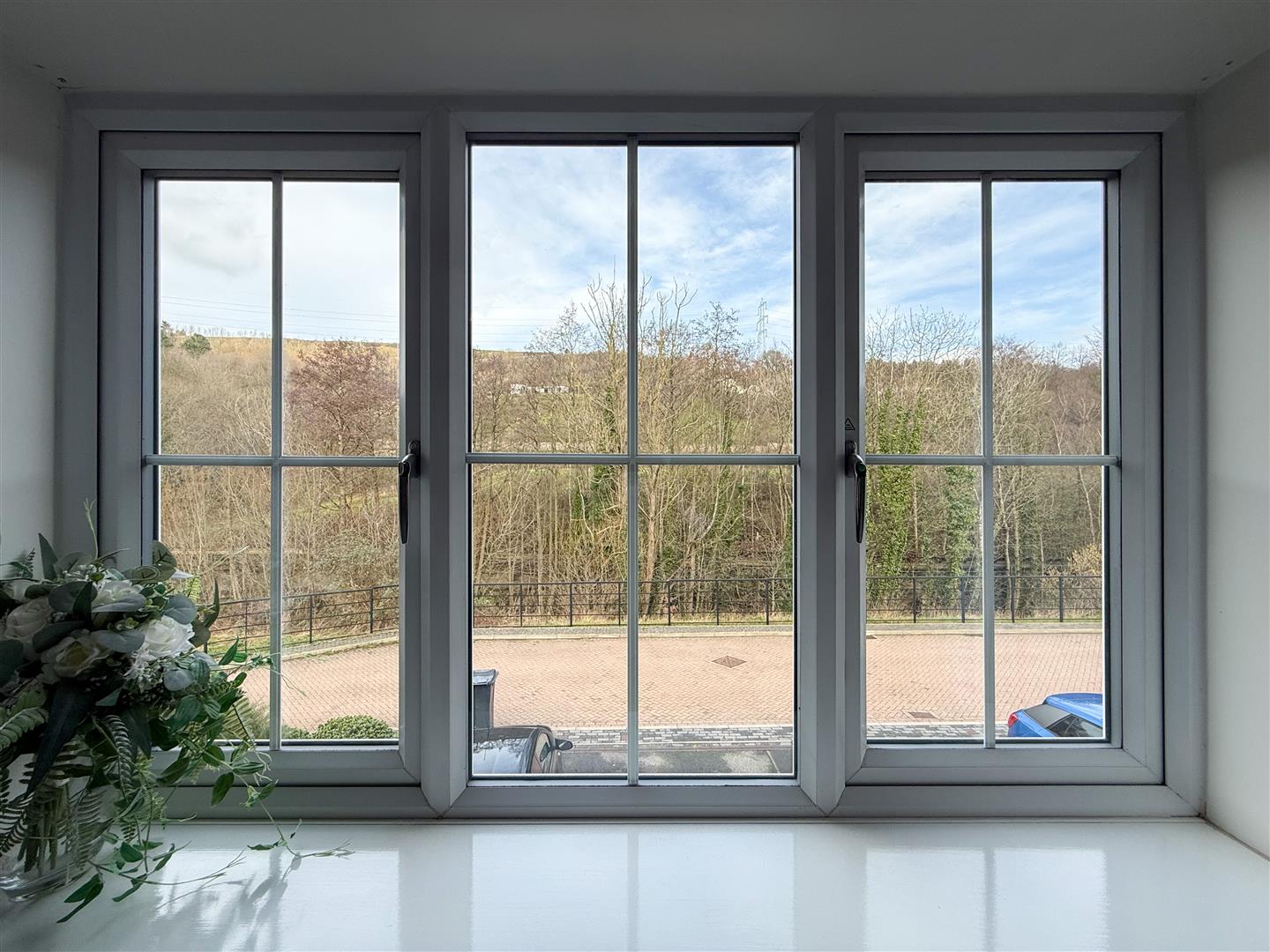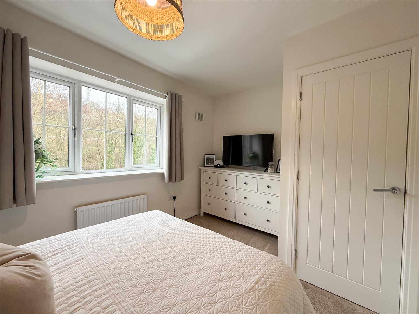 A generously sized bedroom, currently used as the main bedroom, featuring a front-facing uPVC double-glazed window with lovely elevated woodland views and a built-in storage cupboard with a solid door. Carpeted flooring, a ceiling light point, and a central heating radiator complete the room.