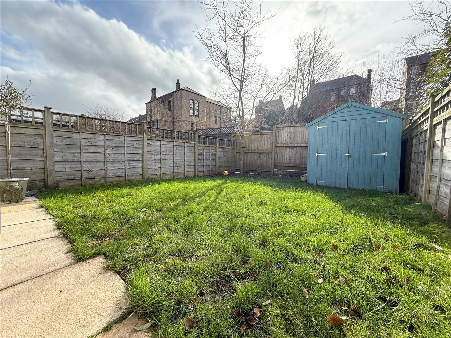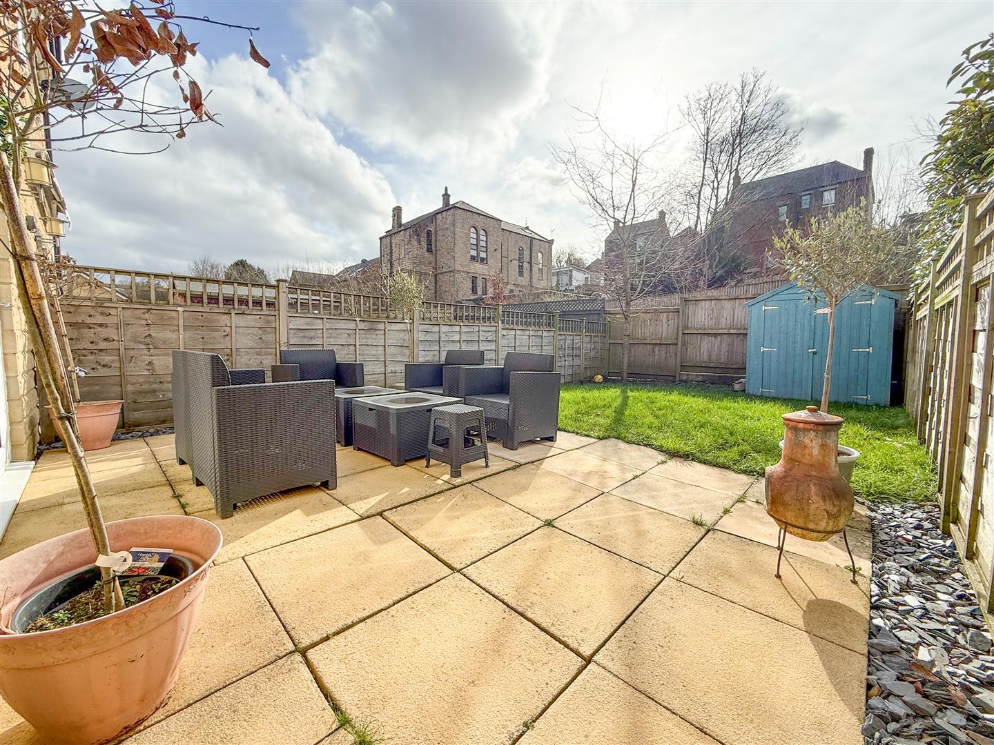 A paved entertaining area extends from the bi-fold doors, leading to a garden mostly laid to lawn. The space is enclosed by fencing and includes a useful storage shed.
