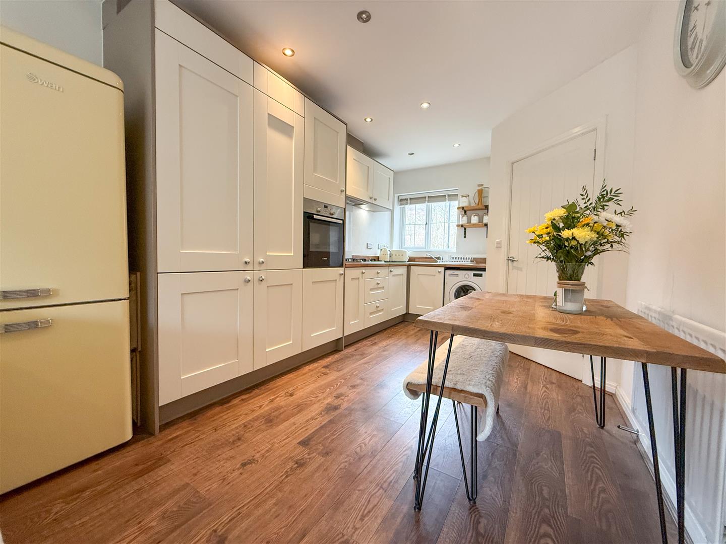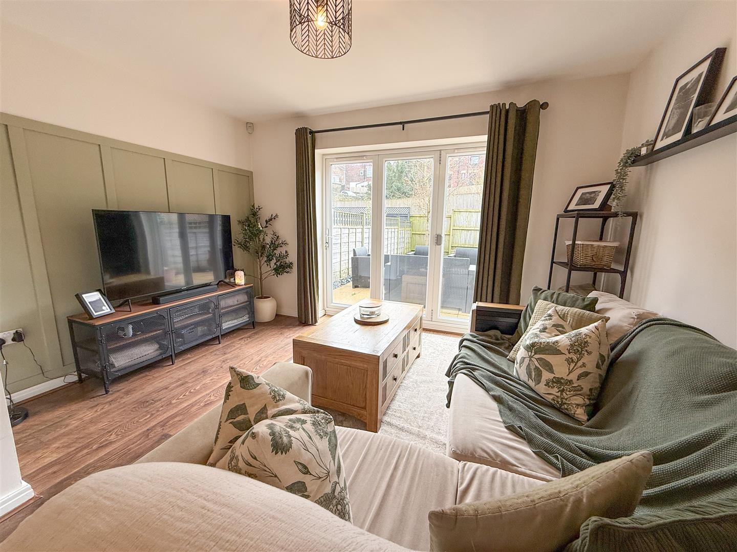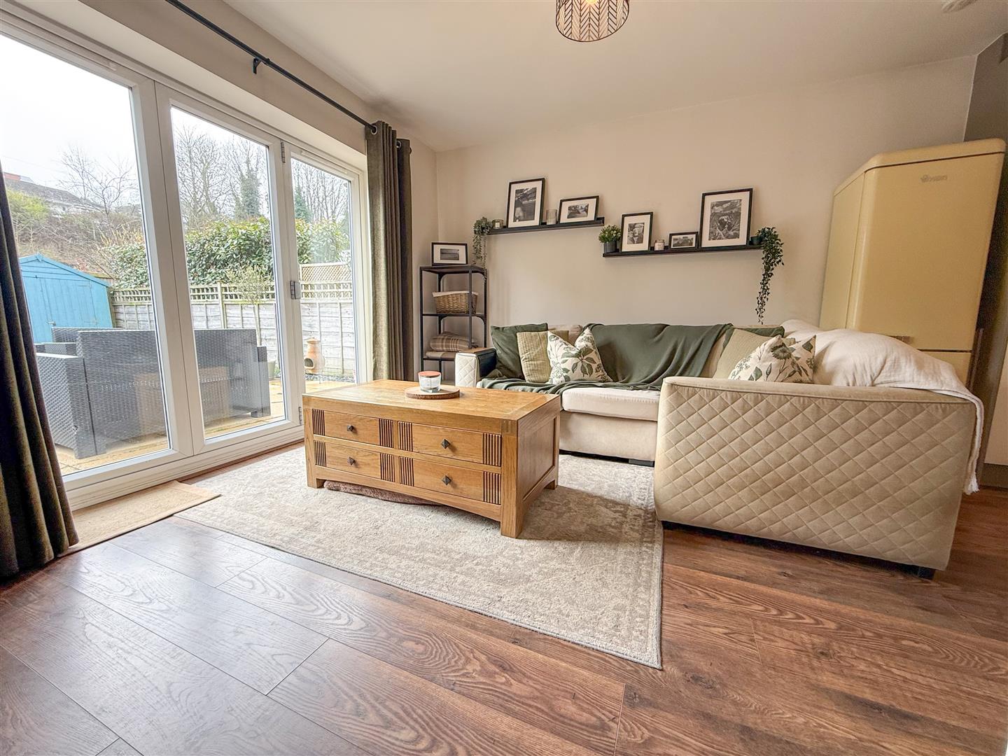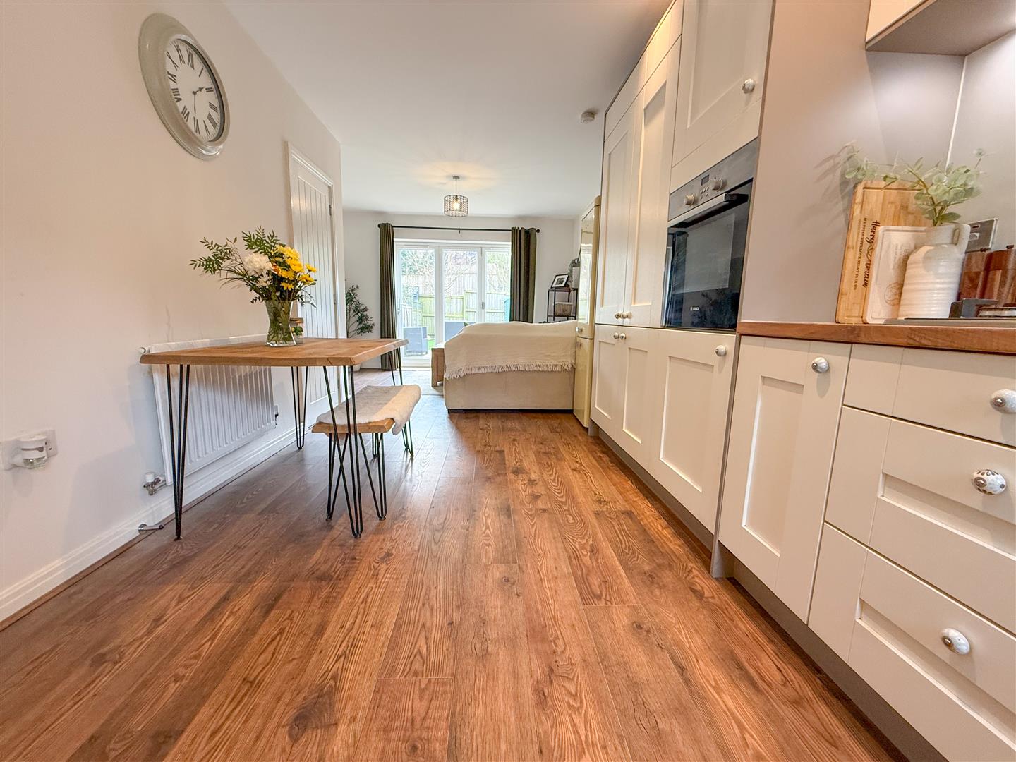 Designed with social living in mind, this generous open-plan space lends itself perfectly to entertaining and everyday family life. The kitchen and dining area is fitted with a range of cream wall, base and drawer units, complemented by wood effect work surfaces and under cupboard lighting. A sink with mixer tap sits beneath a front-facing uPVC double-glazed window, enjoying attractive woodland aspects. Integrated appliances include an electric oven, gas hob with extractor hood above, along with space for an upright fridge freezer and plumbing for a washing machine. Recessed ceiling spotlights, a central heating radiator and ample space for a dining table complete this section. Wood-effect laminate flooring runs throughout, with a solid door leading to a useful under-stairs storage cupboard with lighting. The space then opens effortlessly into the lounge area, where bi-fold doors span the rear elevation, connecting the interior to the garden and ideal for warmer days. A stylish panel feature wall adds character, complemented by an overhead light fitting and a central heating radiator to complete this inviting living area.