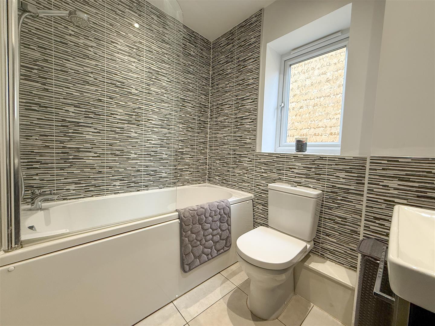A contemporary family bathroom comprising a WC, wash basin set into a vanity unit, and a bath with wall-mounted shower and screen. The walls are fully and partially tiled, with matching tiled flooring. A side-facing uPVC double-glazed obscure window, vertical heated towel rail, recessed ceiling spotlights, and extractor fan provide a practical and stylish finish.