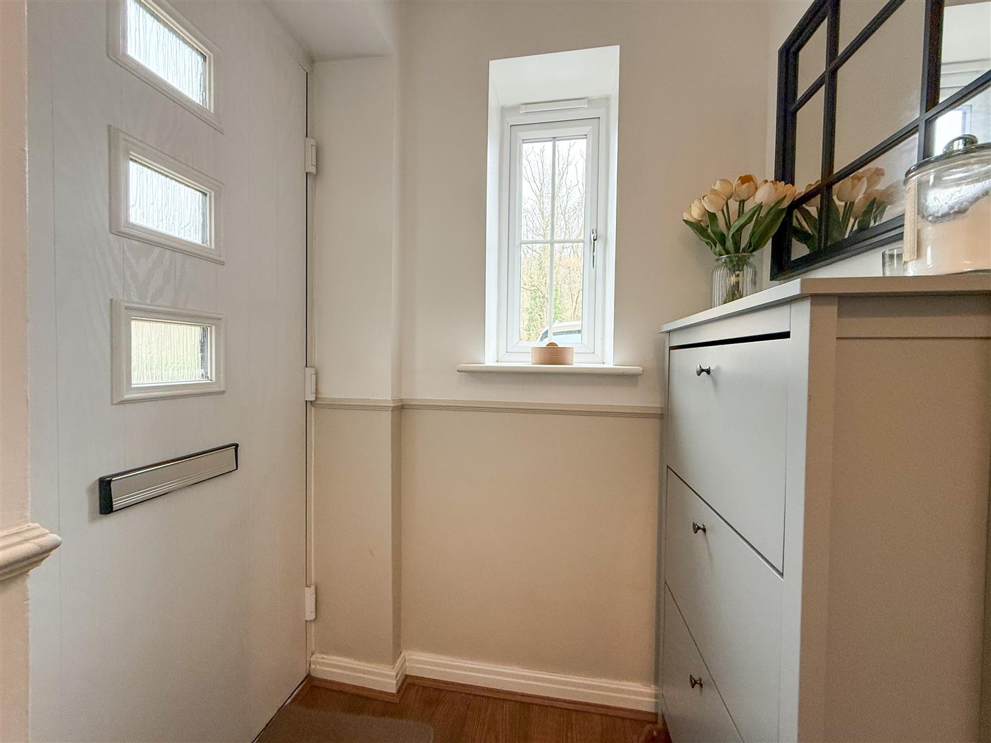 Entered through a sleek, part obscure-glazed composite front door, the hallway creates an immediate sense of warmth and style, enhanced by natural light from a front-facing uPVC double-glazed window. Contemporary wood-effect laminate flooring flows underfoot, complemented by a central heating radiator and panelled wall detailing. A ceiling light point brightens the space, while the staircase leads to the upper level. Solid internal doors provide access to the ground floor cloakroom and the impressive open-plan kitchen, dining, and living space beyond.
