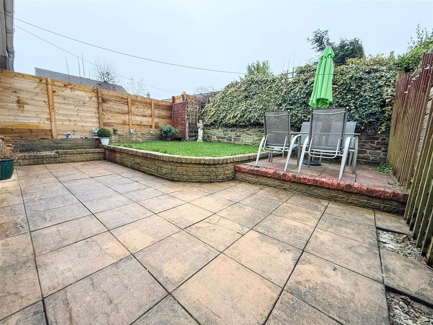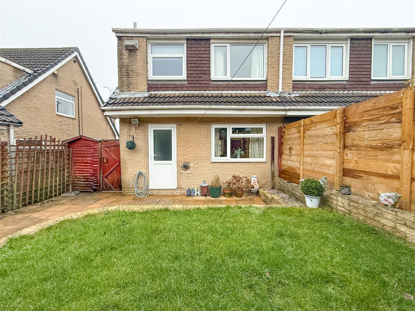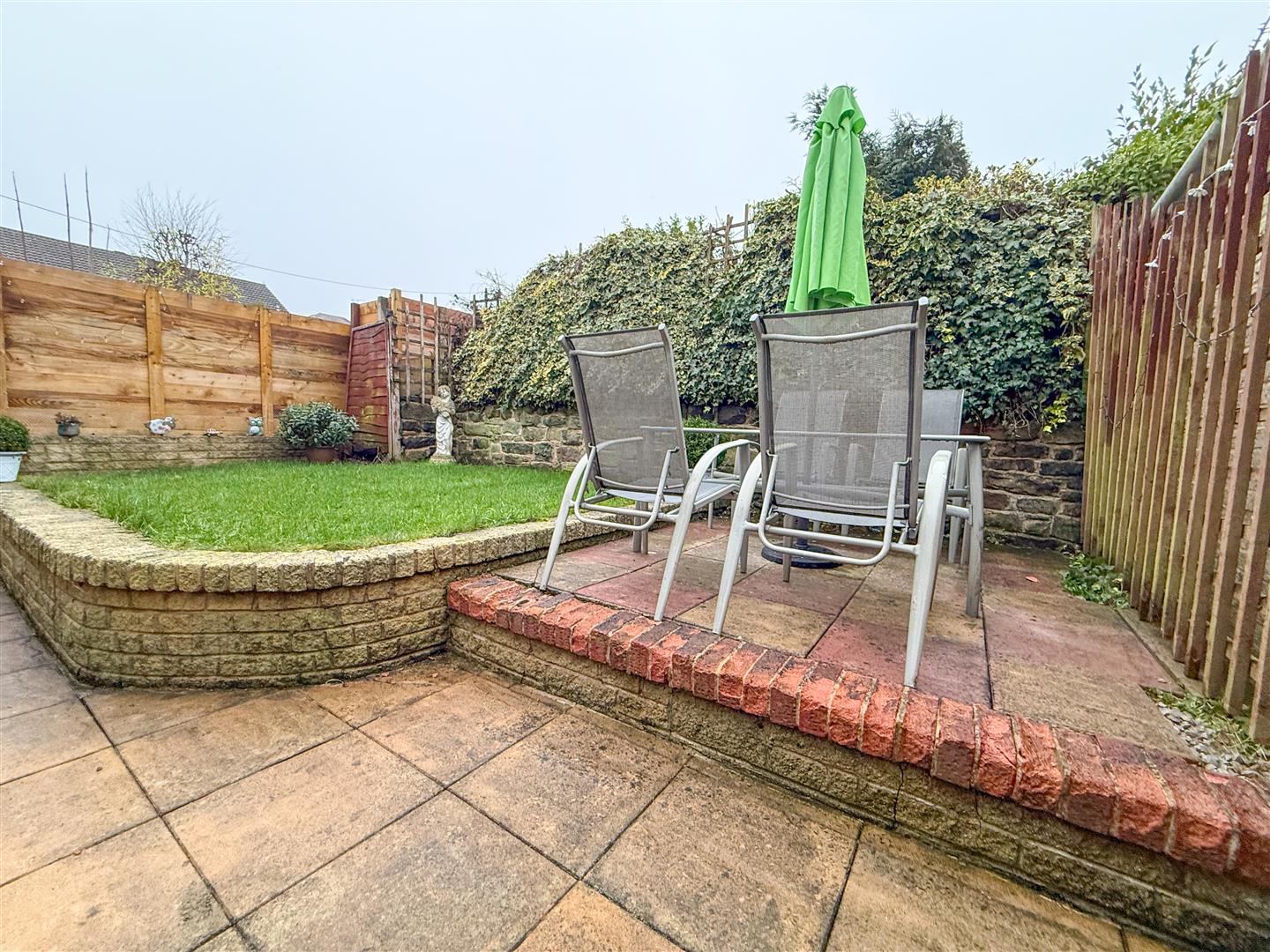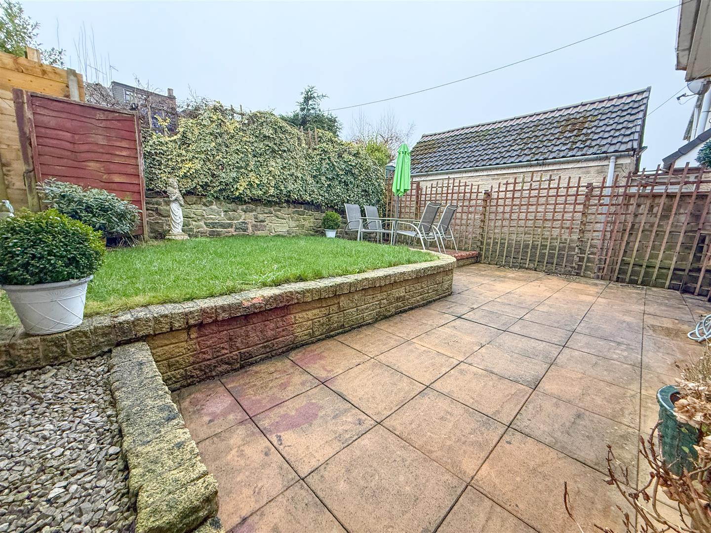 The rear garden features a paved area directly accessed from the kitchen, with a step up to a second paved entertaining space, ideal for seating, alongside a lawn area. A gate provides access to the driveway and front of the property, with a shed positioned behind it. The garden is enclosed by a combination of fencing and brick borders, offering a private, practical, and low-upkeep outdoor space.