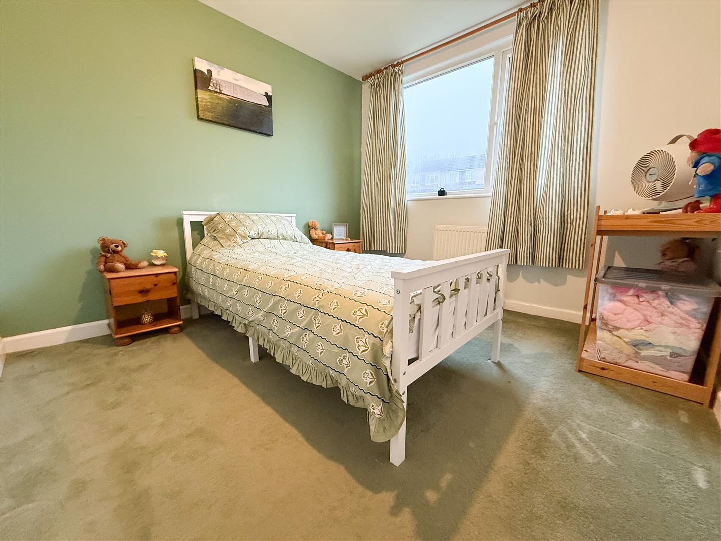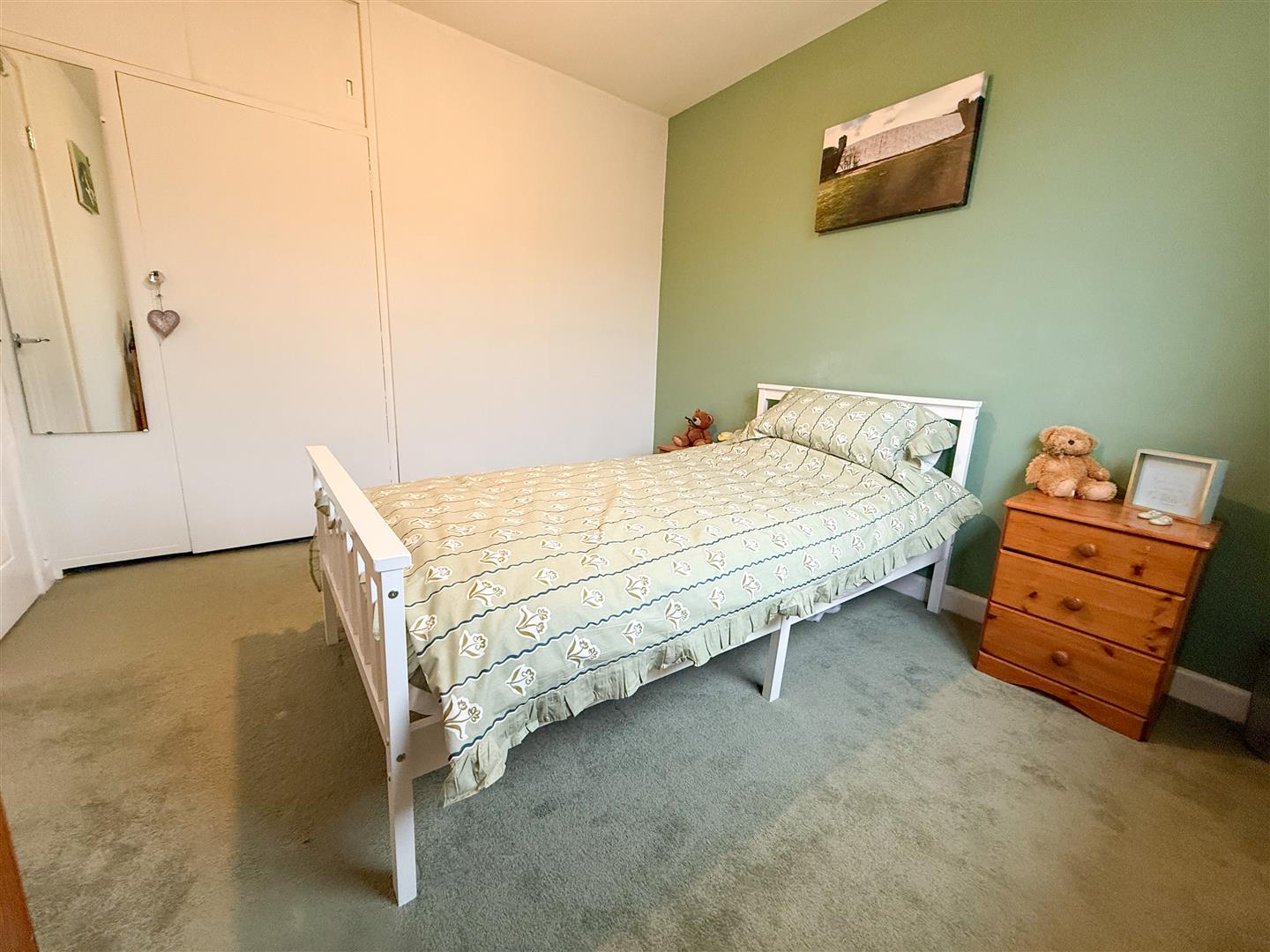 The second bedroom features a uPVC double-glazed window to the rear elevation, allowing plenty of natural light. Built-in wardrobe storage provides practical space, complemented by carpeted flooring, a ceiling light point, and a central heating radiator.