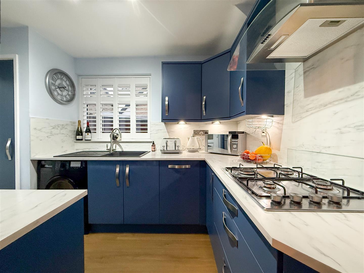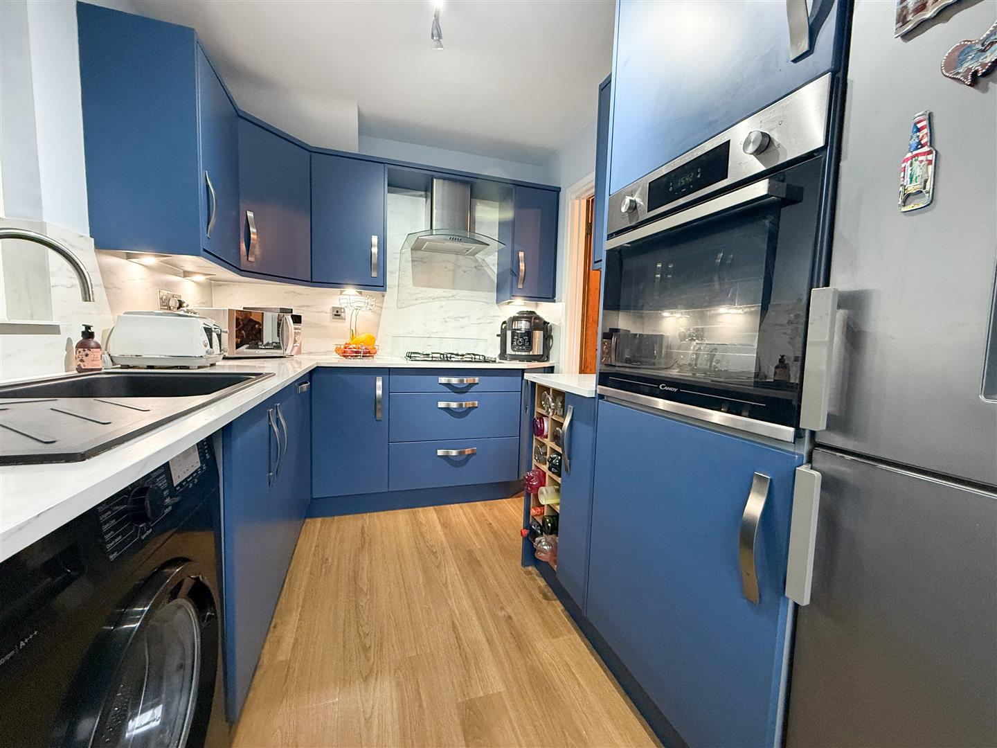 The modern, newly fitted kitchen features stylish blue wall, base, and drawer units topped with Marble Calcutta laminate work surfaces, matching upstands, and splashbacks, complemented by under-unit lighting. A sink and drainer with mixer tap sits beneath a uPVC double-glazed window to the side elevation. Integrated appliances include an oven, hob with extractor, and dishwasher, with additional space and plumbing for a washing machine and room for an upright fridge-freezer. Wood-effect flooring runs throughout, a ceiling light point illuminates the space, and an obscure glazed door provides direct access to the rear garden.
