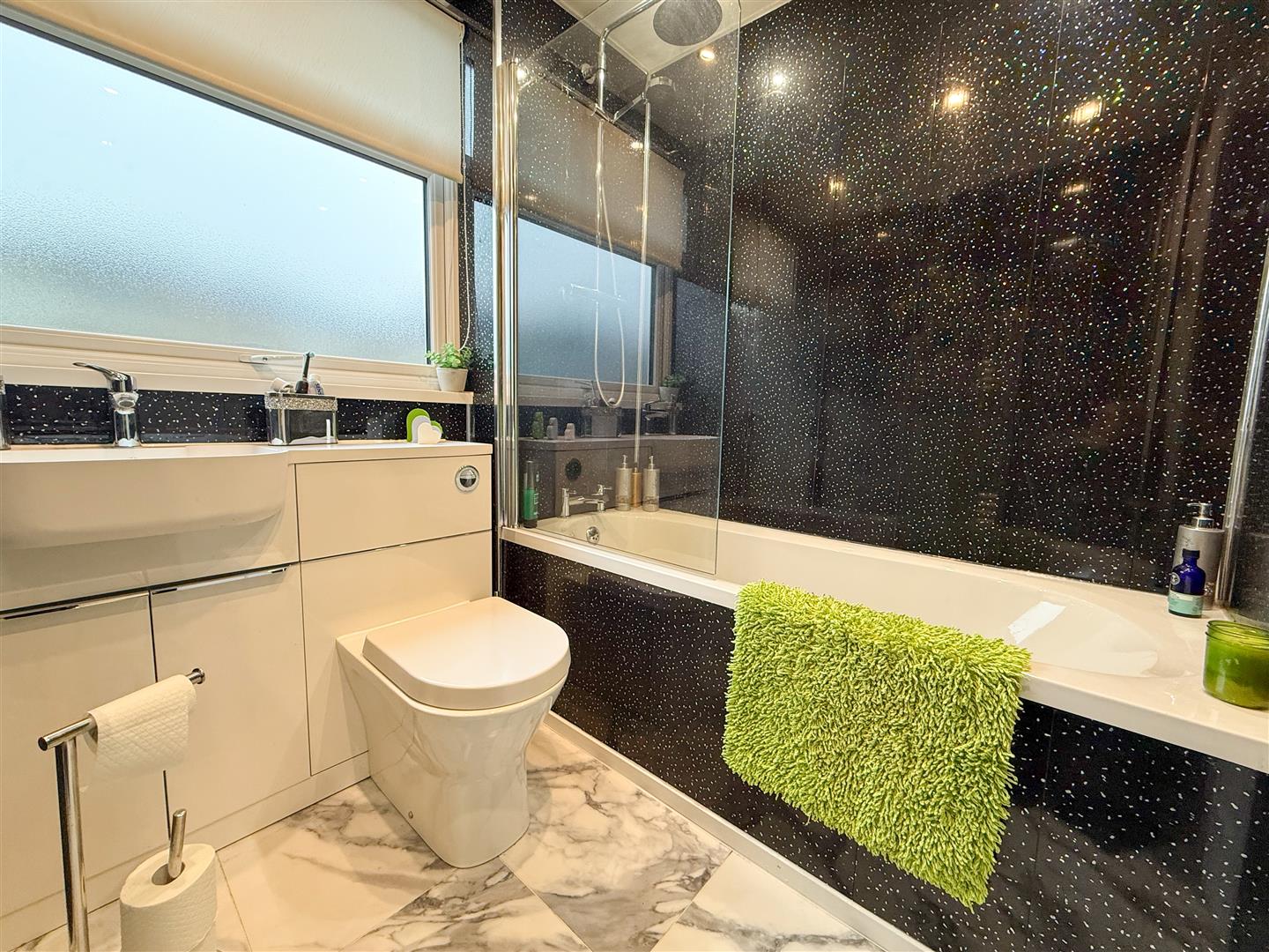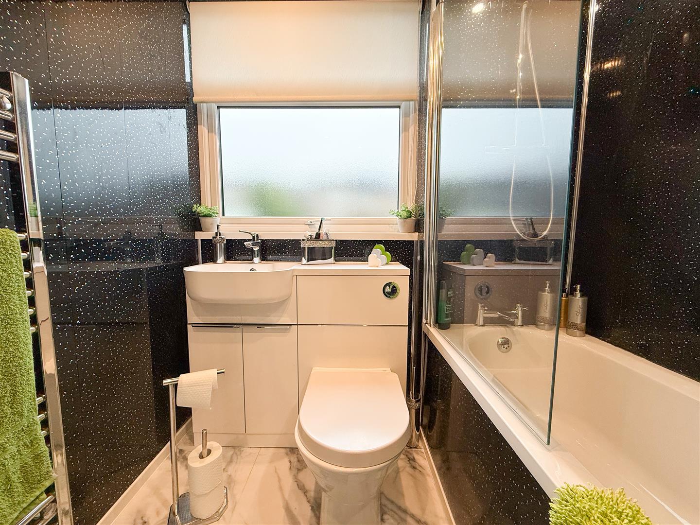 The family bathroom is fitted with a WC and wash basin set into a vanity storage unit, and a bath with a wall-mounted overhead shower and hand-held shower attachment, complete with a screen door and a bath panel finished in matching panelling to the walls. A uPVC double-glazed obscure window to the rear elevation provides natural light, while contemporary panelled walls, tiled flooring, a vertical heated towel rail, and recessed ceiling spotlights complete this stylish bathroom.