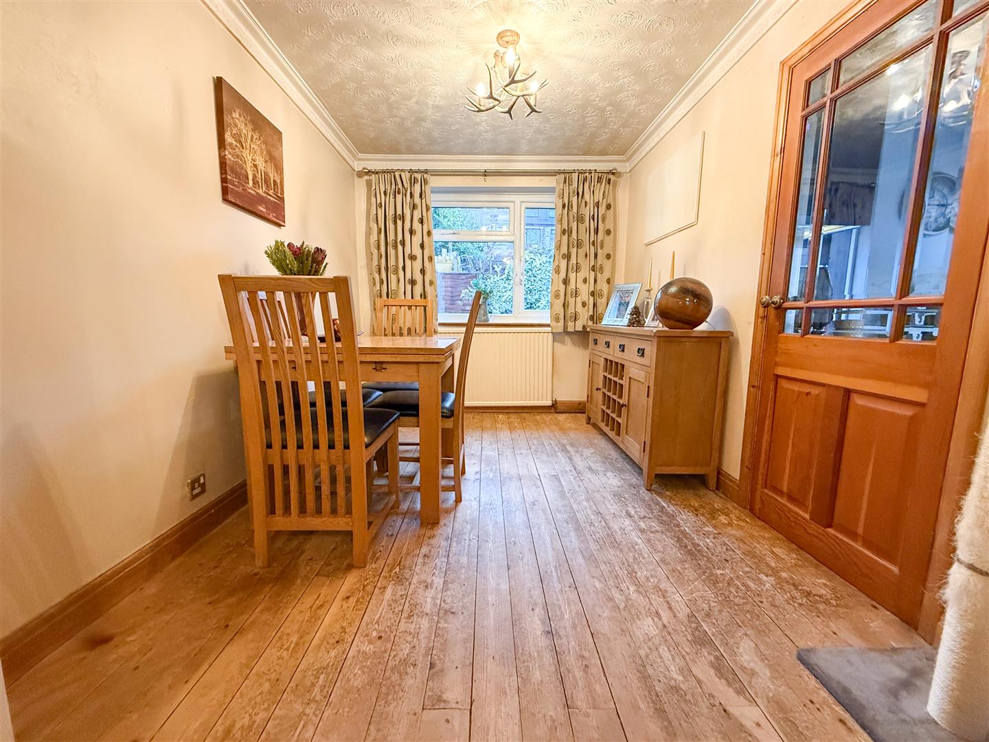 The dining area enjoys a uPVC double-glazed window overlooking the rear garden. Solid wooden flooring extends throughout, accompanied by a ceiling light point and central heating radiator, creating a practical and connected space for meals and entertaining.