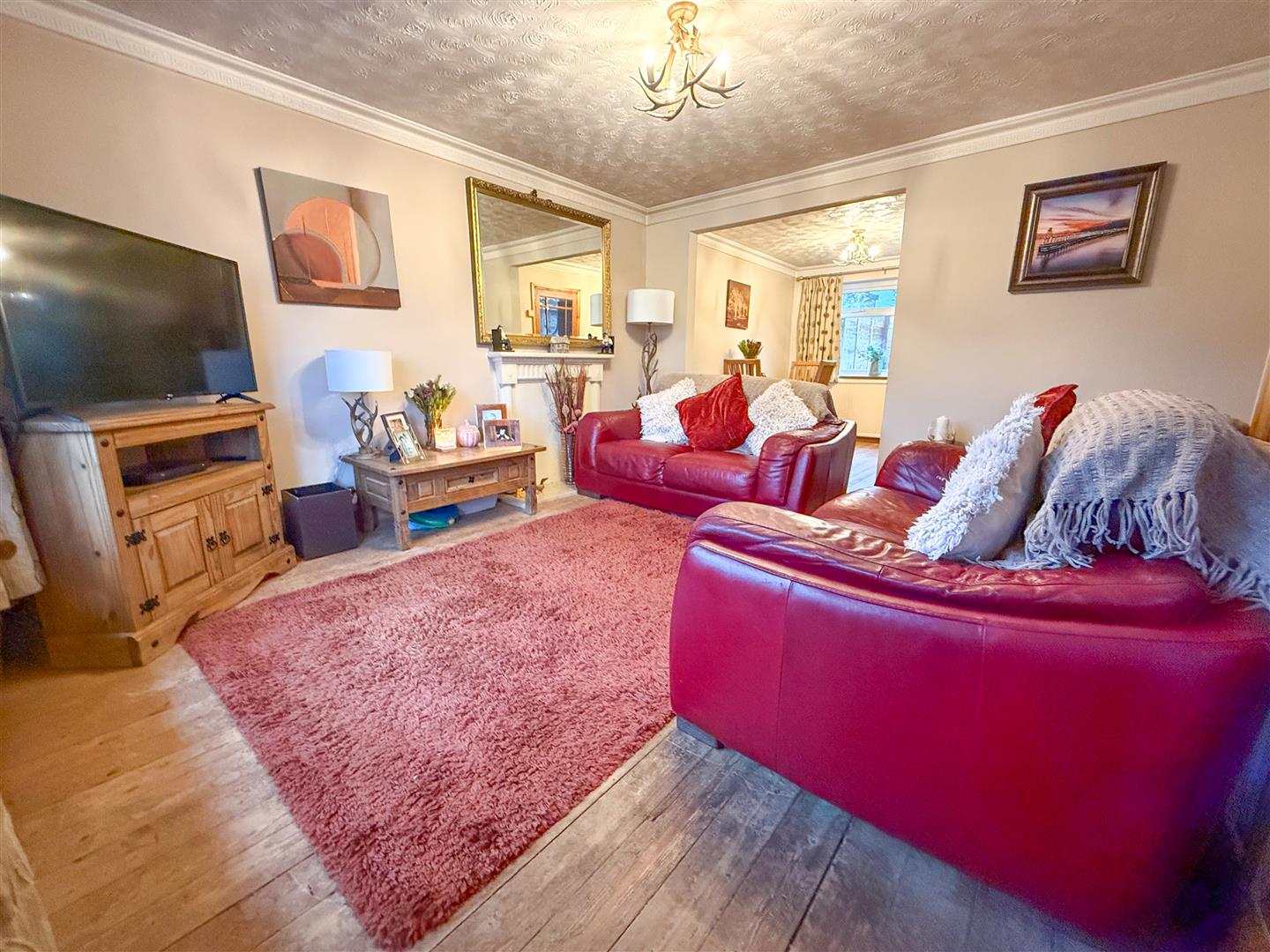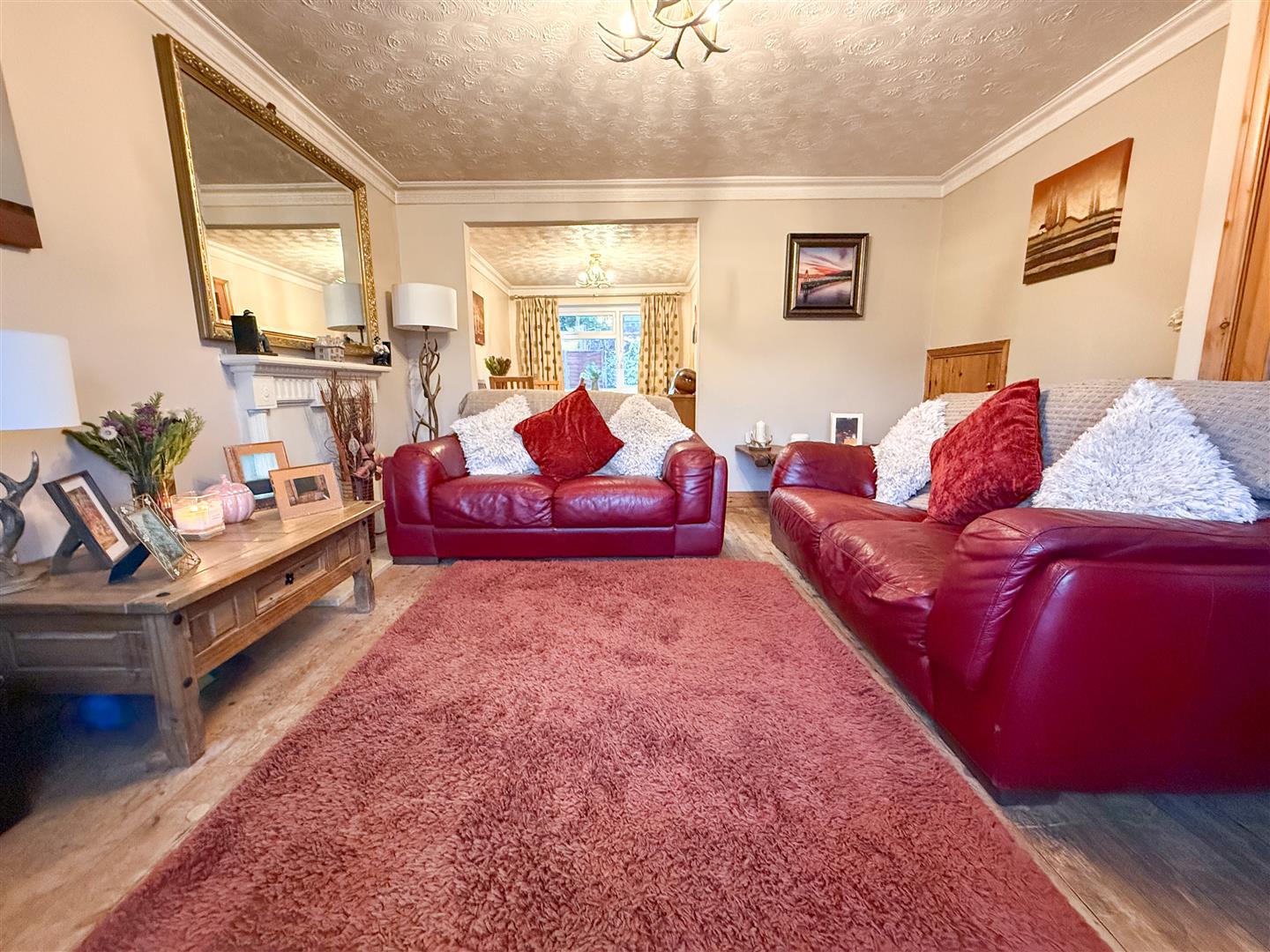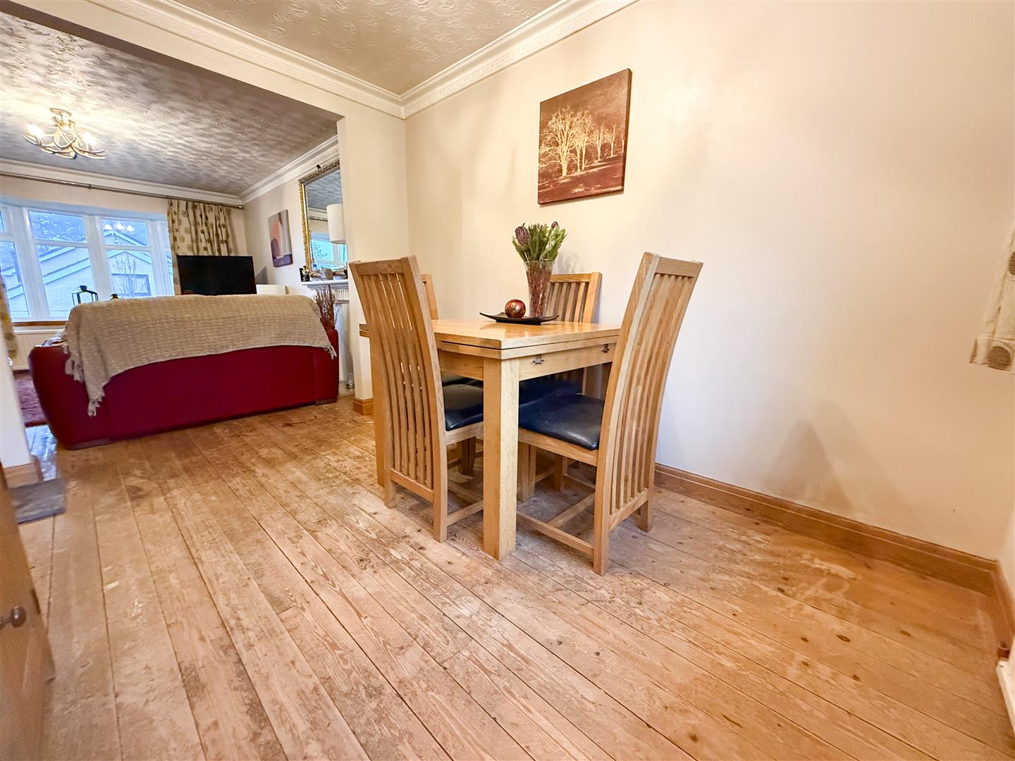 The lounge features a charming fireplace surround and a uPVC double-glazed window to the front elevation, filling the room with natural light. Solid wooden flooring, a ceiling light point, and a central heating radiator add warmth, while a solid door provides access to under-stair storage. Open access leads seamlessly into the dining area, enhancing the sense of space.