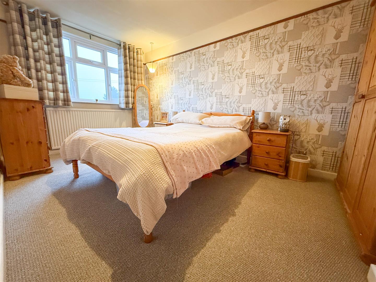 This lovely primary bedroom boasts a uPVC double-glazed window to the front elevation, offering elevated views over the village and surrounding woodland. Carpeted flooring, ceiling light points, and a central heating radiator complete this bright and inviting main bedroom.